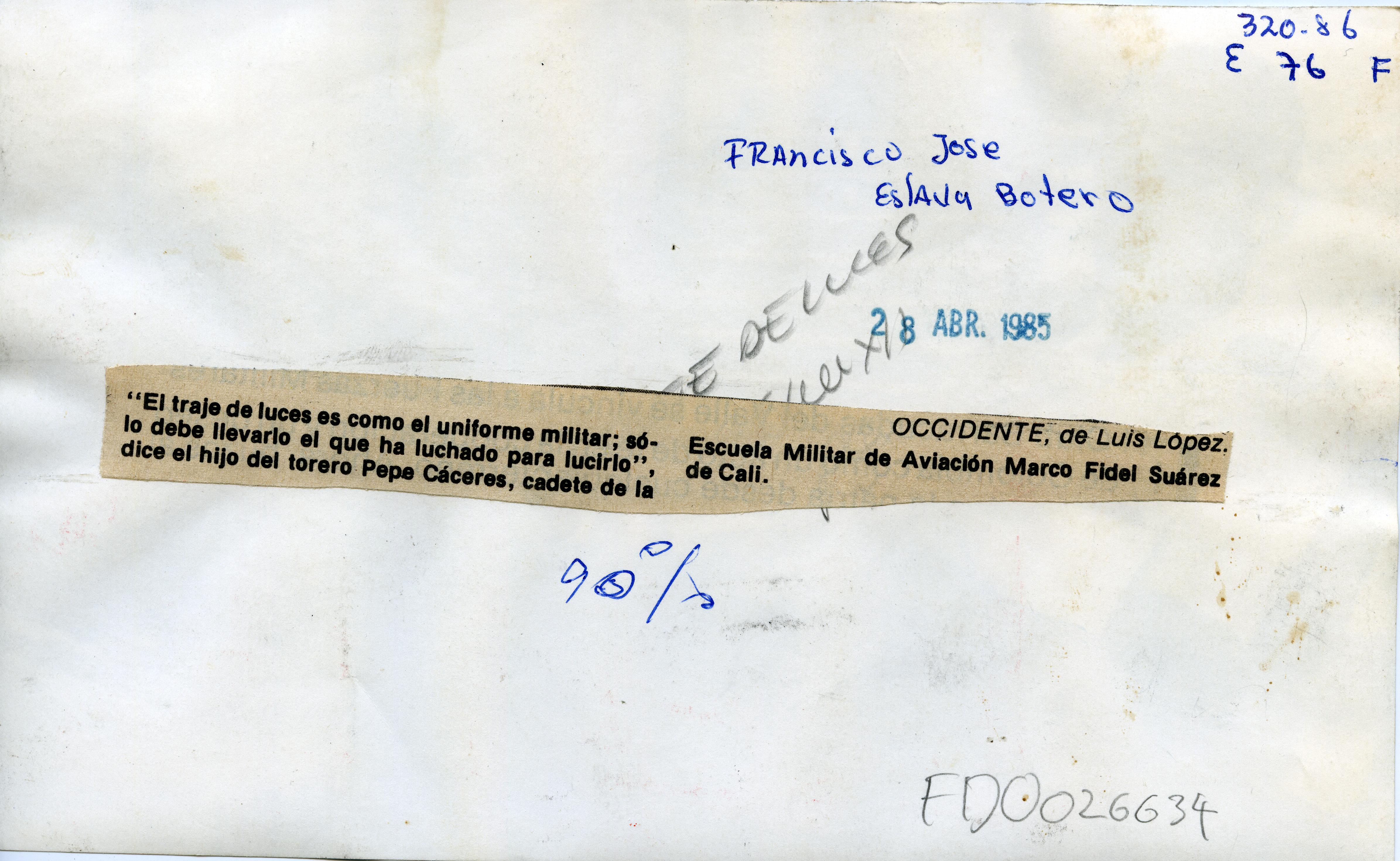 Reverso "El traje de luces es como el uniforme militar; sólo debe llevarlo el que ha luchado para lucirlo, dice el hijo del torero pepe Cáceres, el cadete de la Escuela Militar de Aviación Marco Fidel Suárez de Cali," Manuscrito" Francisco José Eslava Botero".