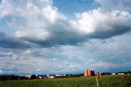 En esta bella composición ¾ partes de la imagen está copada por unas grandes nubes Cumulus Nimbus cargadas de agua, contrastando con el abismal azul del cielo. La profundidad de campo es maravillosa ya que se divisa a lo lejos la nitidez en el horizonte.Las edificaciones se perfilan a lo lejos.