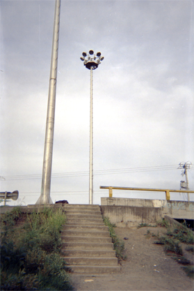 Se observan escaleras que conducen a una vía principal en el bloque inferior. En el centro de la imagen poste metálico con lámparas. Al lado izquierdo se aprecia parcialmente un poste. Toma en contrapicado. Plano general.