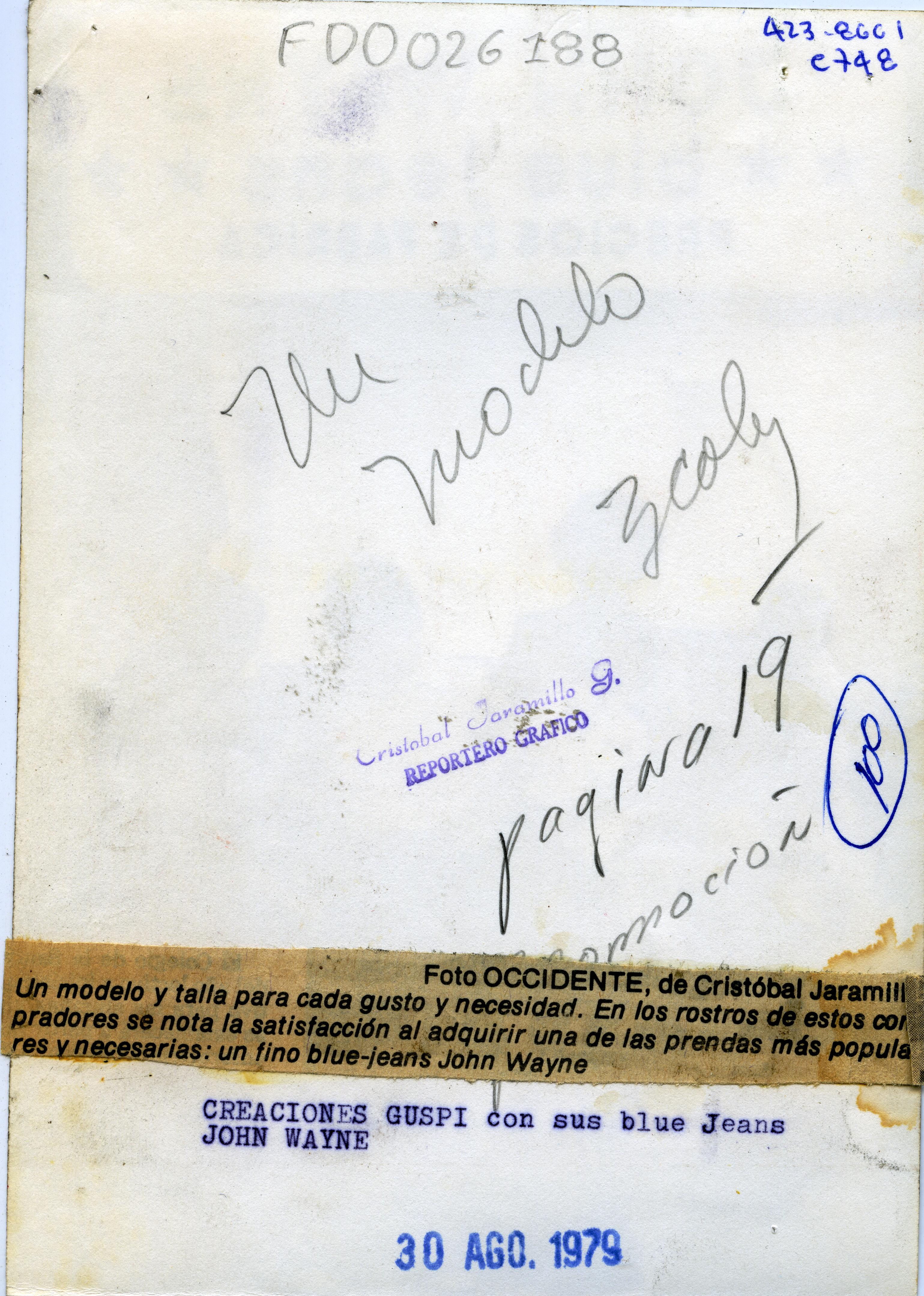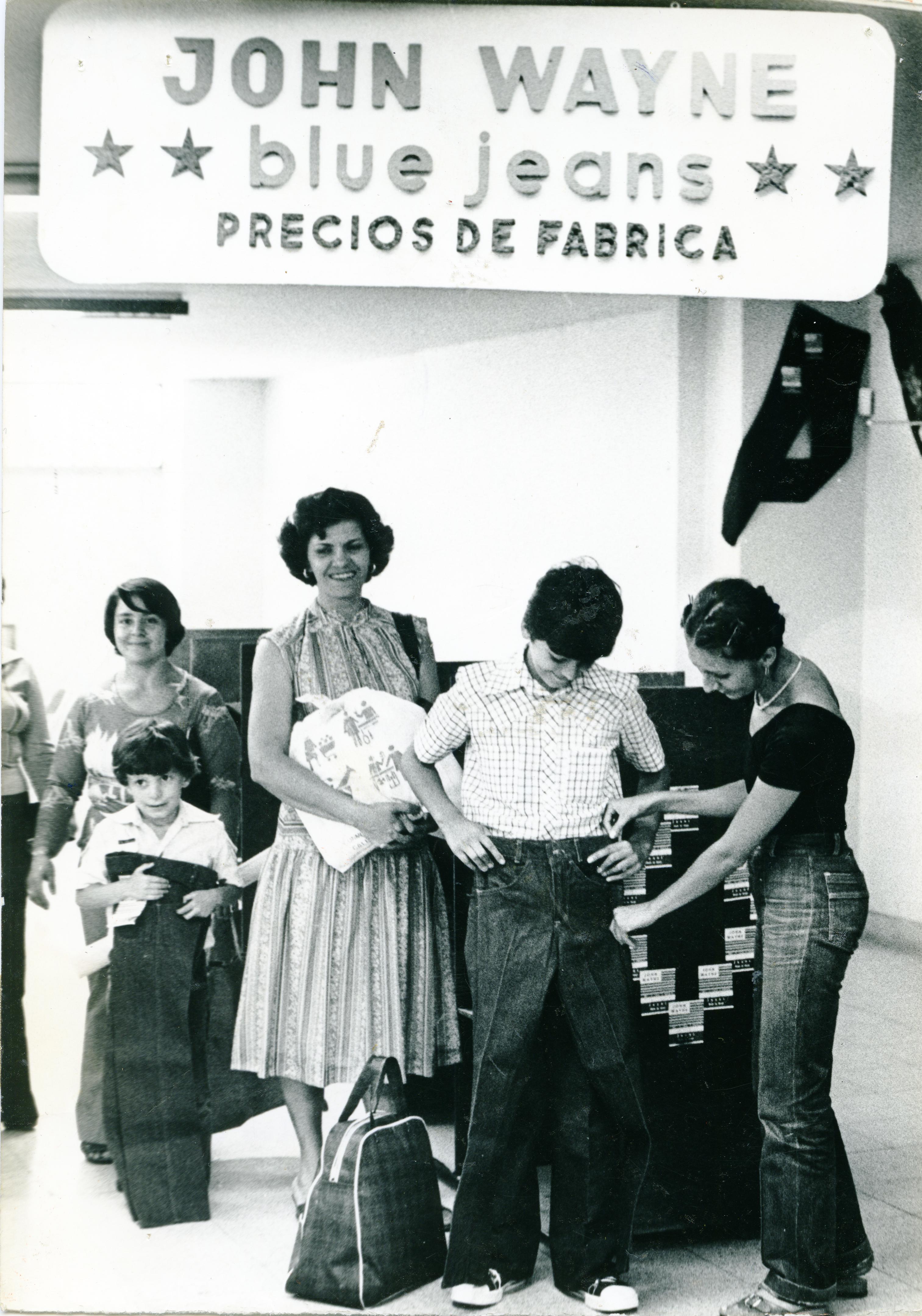 Reverso: Un modelo y talla para cada gusto y necesidad. En los rostros de estos compradores se nota la satisfacción al adquirir una de las prendas más populares y necesarias: un fino blue-jeans John Wayne.