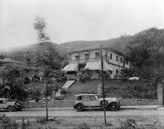Casa de la familia López Vallarino, primera casa quinta construida en el barrio Granada; se observa igualmente dos modelos de carros que circulaban en estos años. Santiago de Cali, 1929.