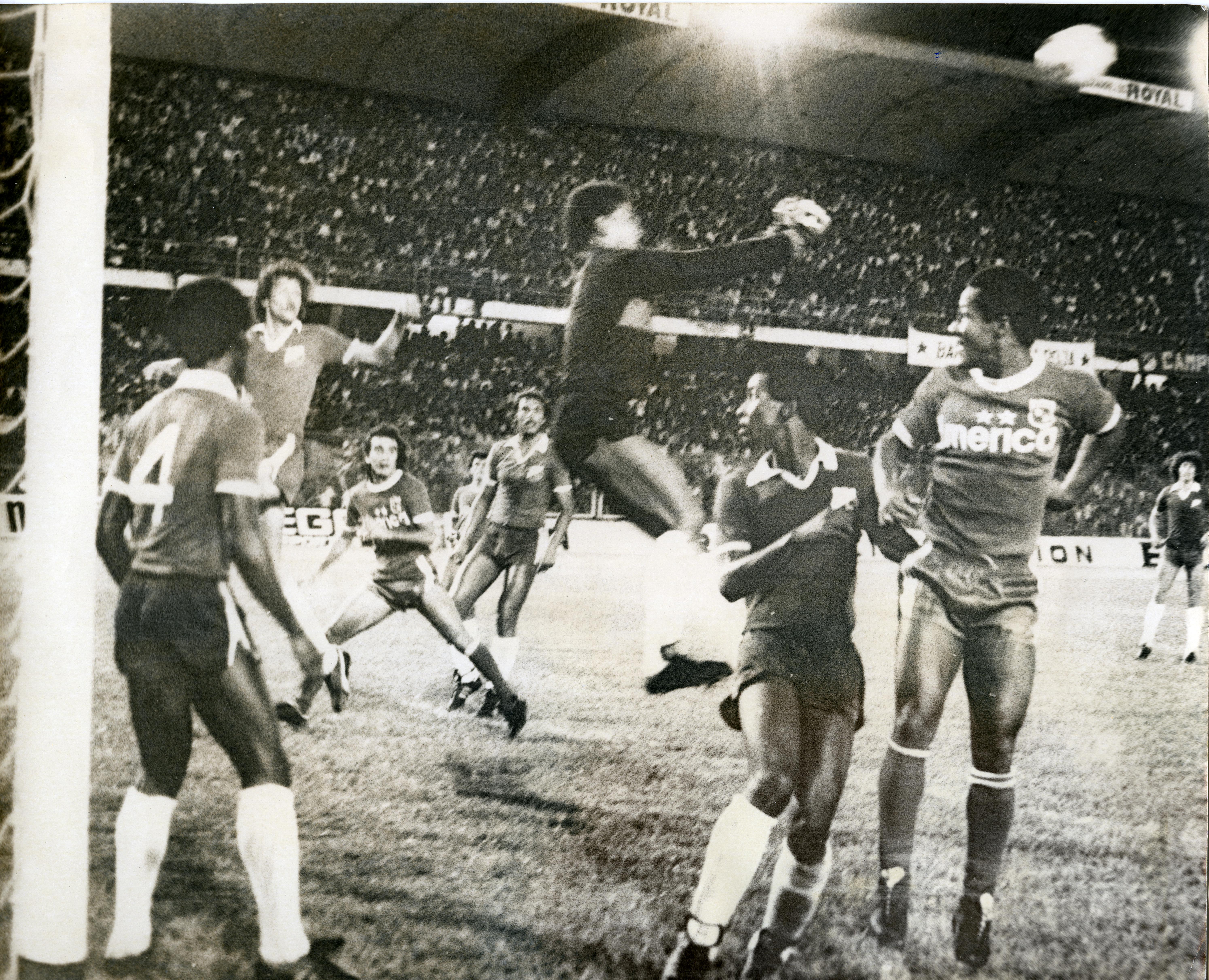 En la gráfica se observa a un arquero atajando el balón que, en el aire, se dirige hacia la portería. Varios jugadores alrededor están pendientes de la acción.. De dondo gradas con aficionados.