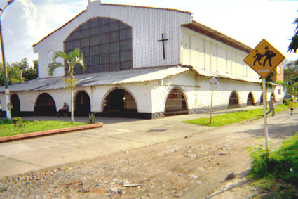 | dc.description | Imagen tomada en exterior, donde se aprecia la fachada de una iglesia de color blanco con arcos oscuros. Al extremo derecho una vía en la que se destaca una señal de transito de color amarillo. | spa |