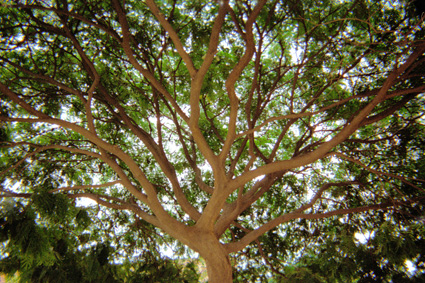 Plano medio, contra picado en la que se puede apreciar un árbol con sus ramas y follaje. Imagen tomada con luz día.