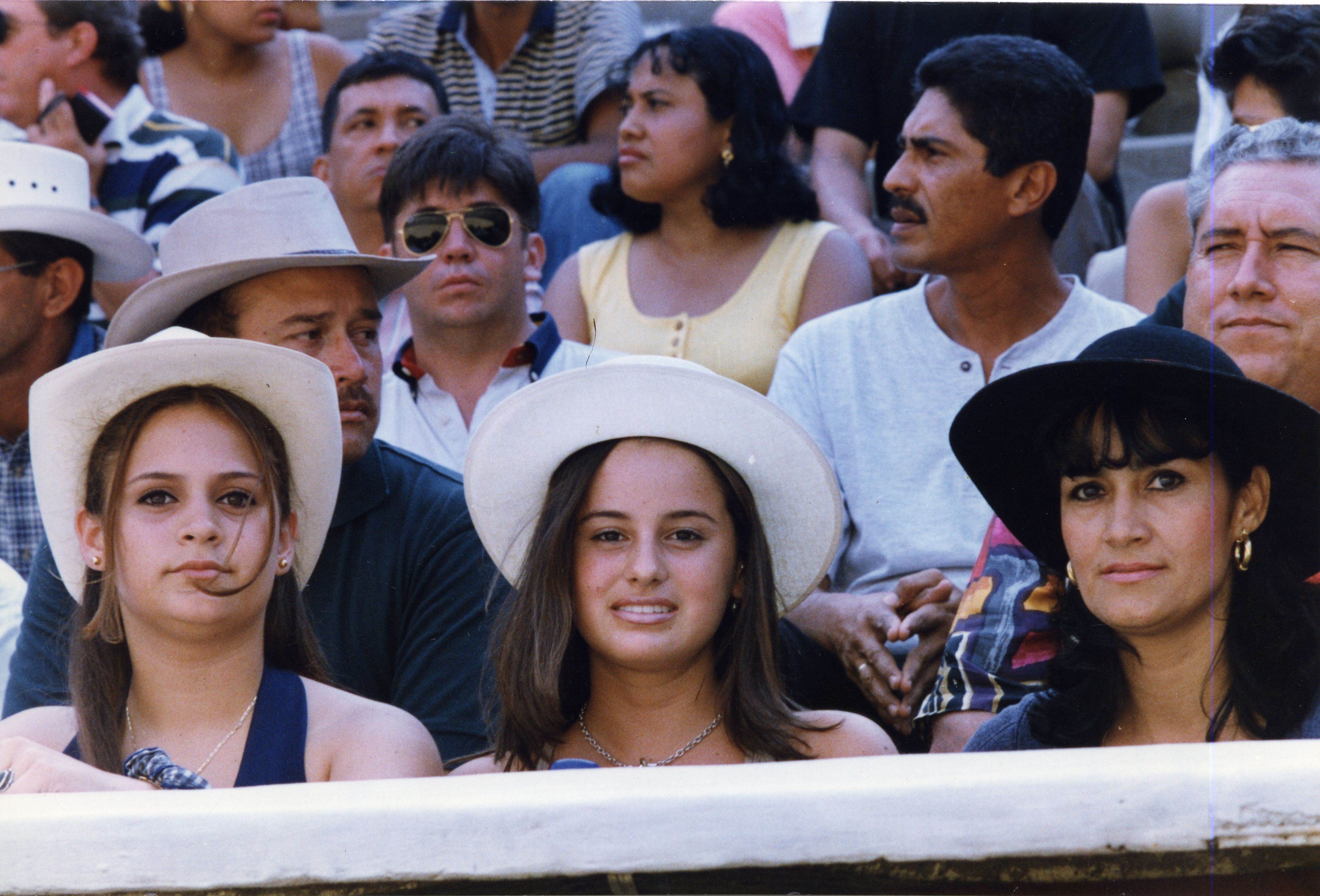Plaza de Toros de Cañaveralejo. Inauguración con la primera corrida que se celebró el 28 de diciembre de 1957 con toros de la ganadería Clara Sierra que lidiaron Joselillo de Colombia, Joaquín Bernardo y Gregorio Sánchez. Se aprecia mujeres de sombrero y atractivas aficionadas a los toros