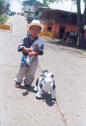 Niño con sus juguetes, un caballito de palo y una vaquita inflable. La Cumbre, C. 1997.