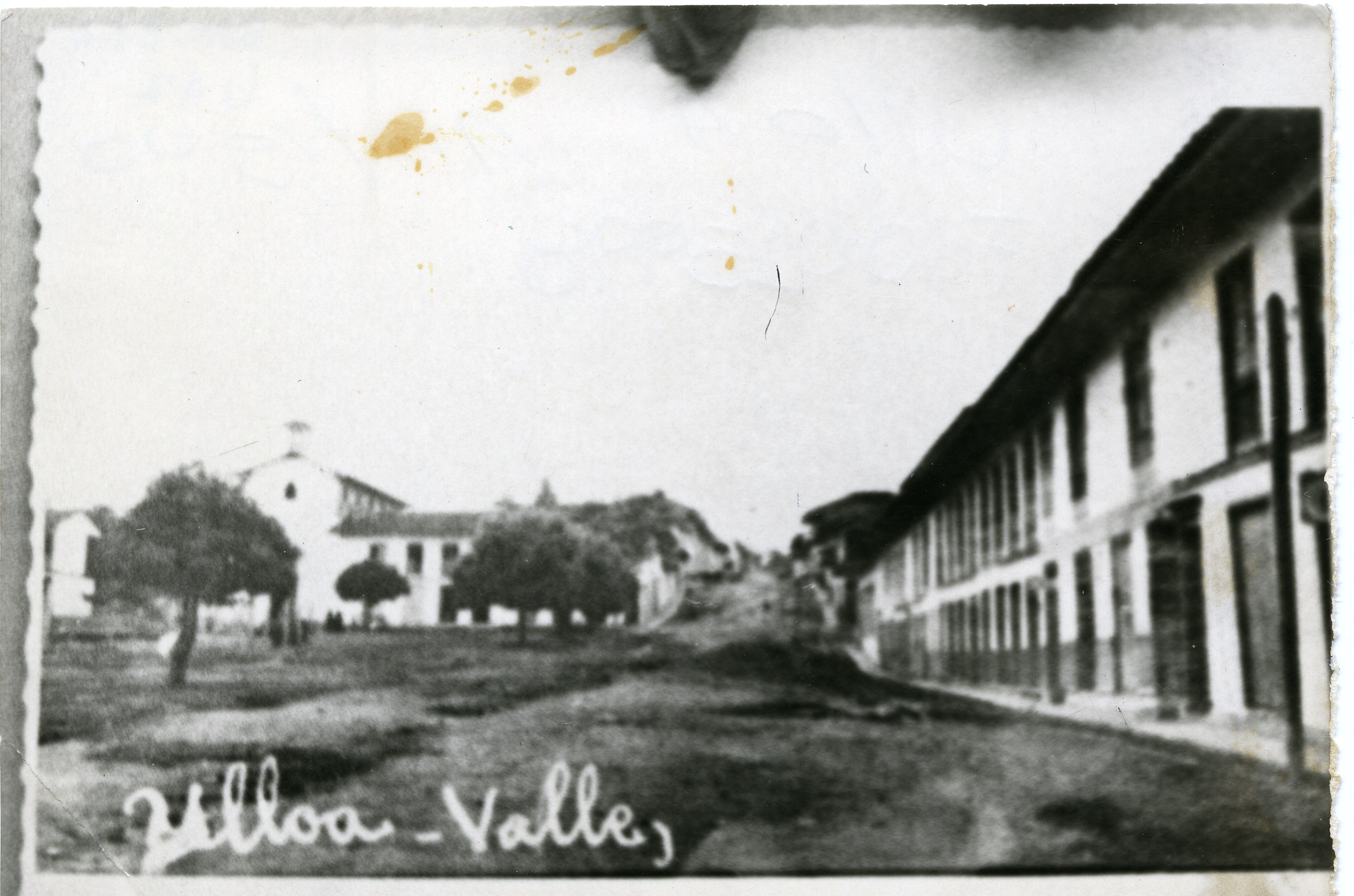 Fotografía de una estampilla del Municipio de Ulloa; se logra observar una calle, al lado derecho de logra ver casas; al lado izquierdo, algunas casas; en la parte inferior de la foto, en letra cursiva dice "Ulloa - Valle"