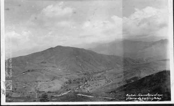 Río Cali, Carretera al mar y Cerro de los Cristales.Santiago de Cali, fecha aproximada,1930.