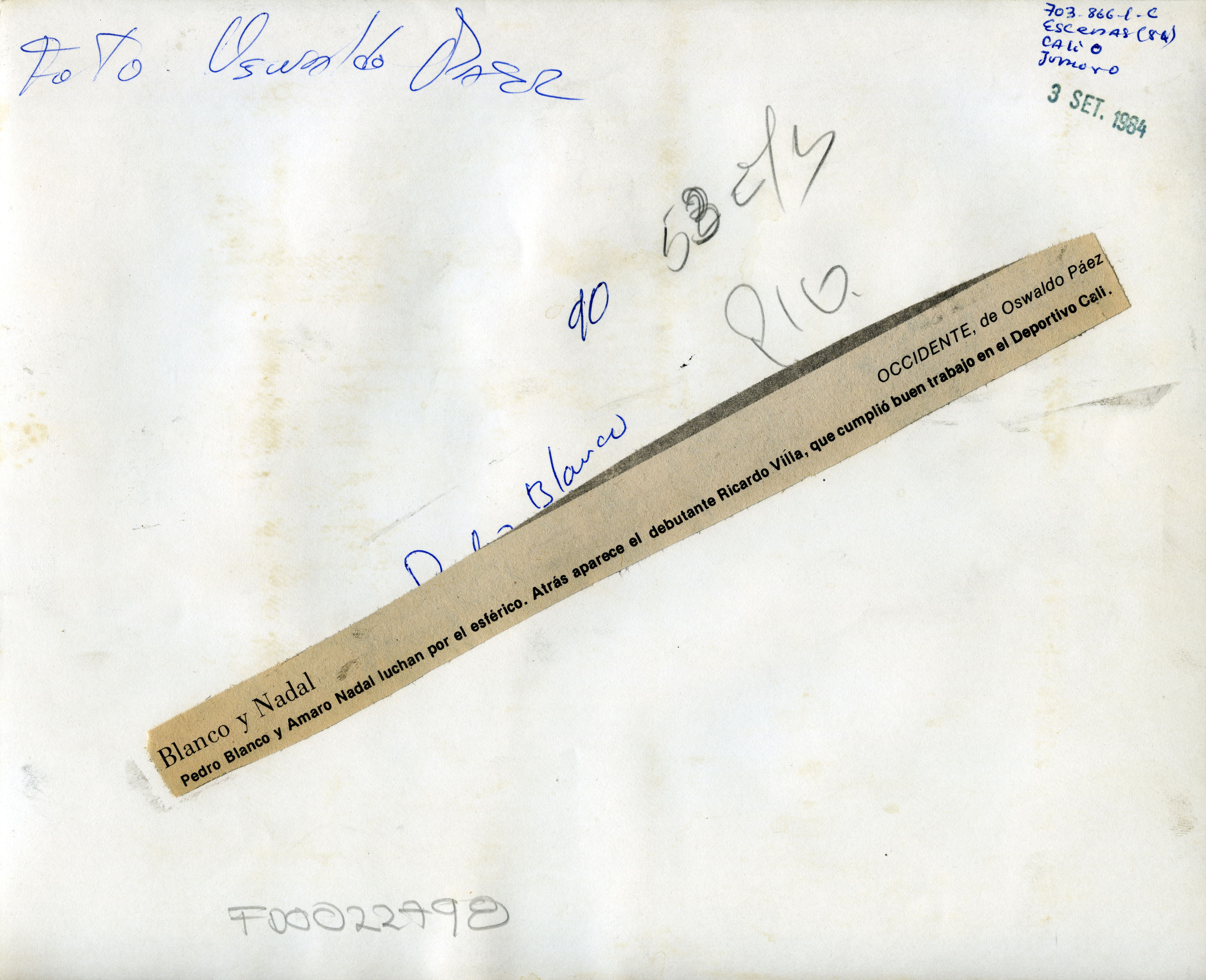Reverso: Pedro Blanco y Amaro Nadal luchan por el esférico.Atrás aparece el debutante Ricardo Villa,que cumplió un buen trabajo en el Deportivo Cali