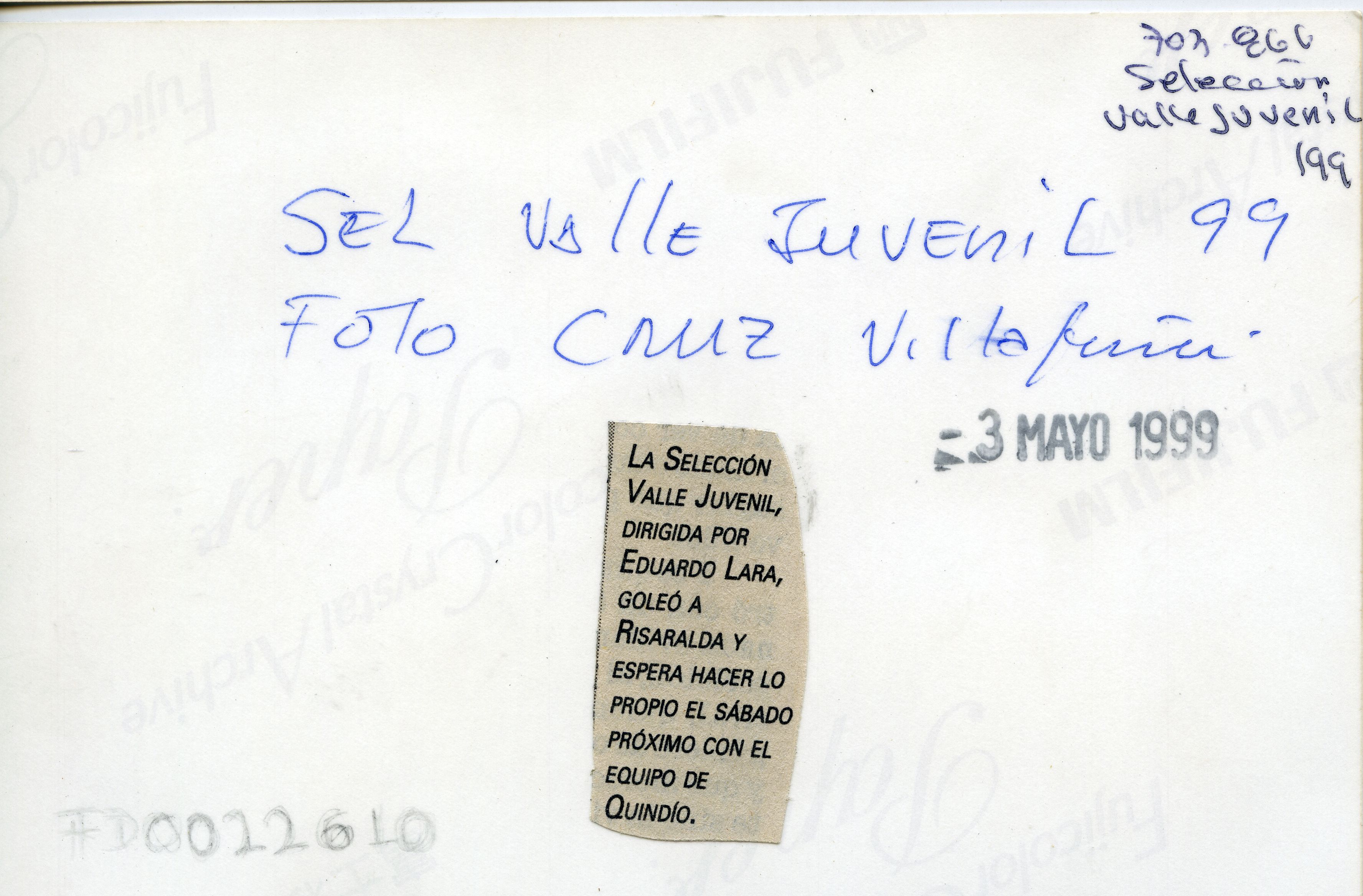 Al reverso de la fotografía se anexa escrito: La selección Valle Juvenil, dirigida por Eduardo Lara, goleó a Risaralda y espera hacer lo propio el sábado próximo con el equipo Quindío