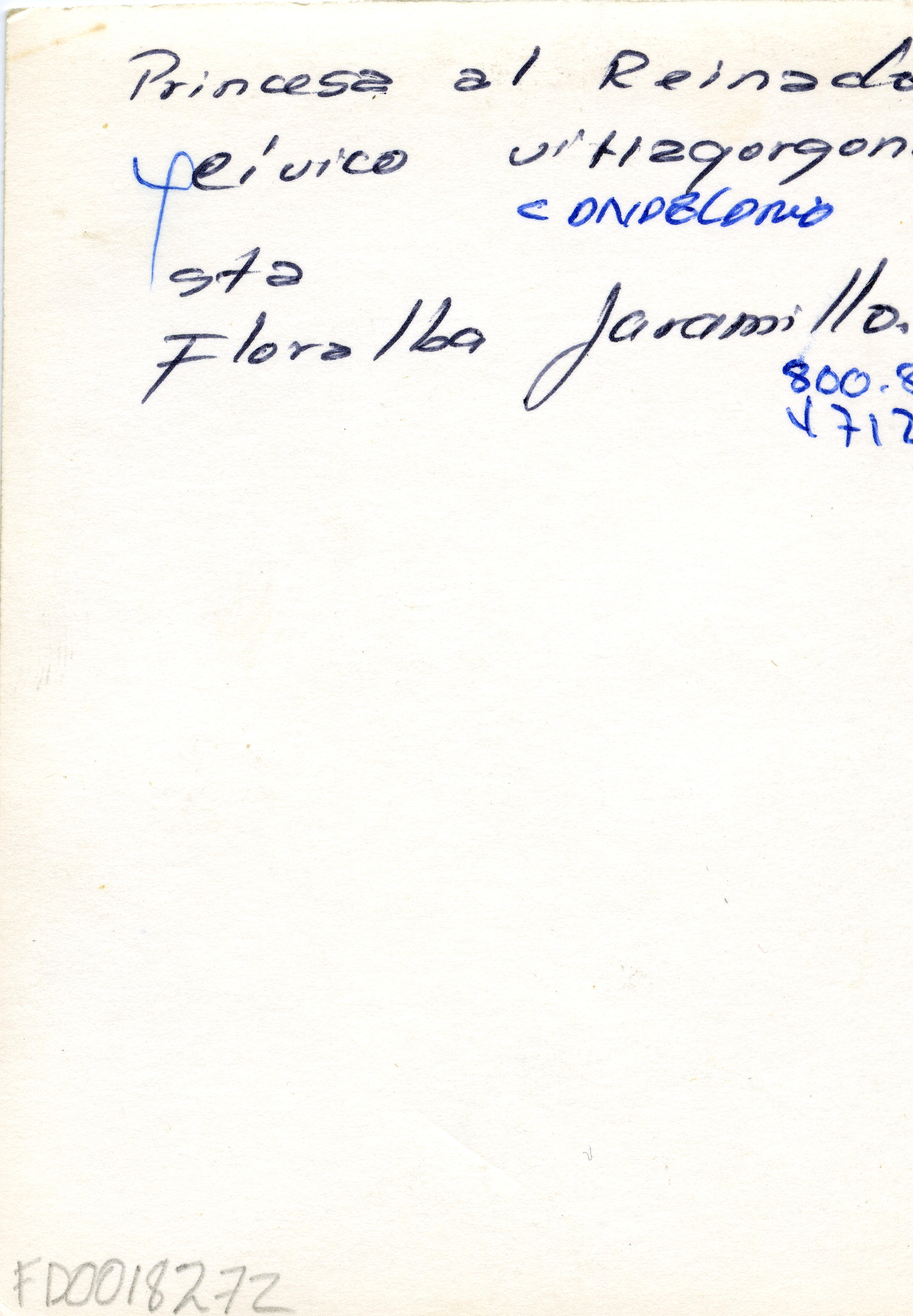 Al reverso de la fotografía se anexa nota manuscrita. "Princesa al reinado cívico Villagorgona. Señorita Floralba Jaramillo"