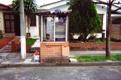 Plano Medio. En la imagen se observa una caseta de vigilante elaborada en ladrillo, aluminio y vidrio. En ella un hombre sentado se asoma por una ventana. De forma casi simétrica dos árboles están dispuestos a lado y lado de la caseta.