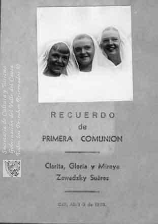 Recuerdo de primera comunión de Clarita. Gloría y Mireya Zawadski Suárez. Cali. 1938.