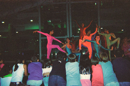 Orjuela Betancourt, M. (2005). Imagen tomada en exterior, de noche, donde se puede apreciar un grupo de personas con una puesta en escena teatral, vestidas con trajes de colores saturados. Santiago de Cali: Biblioteca Departamental Jorge Garces Borrero.
