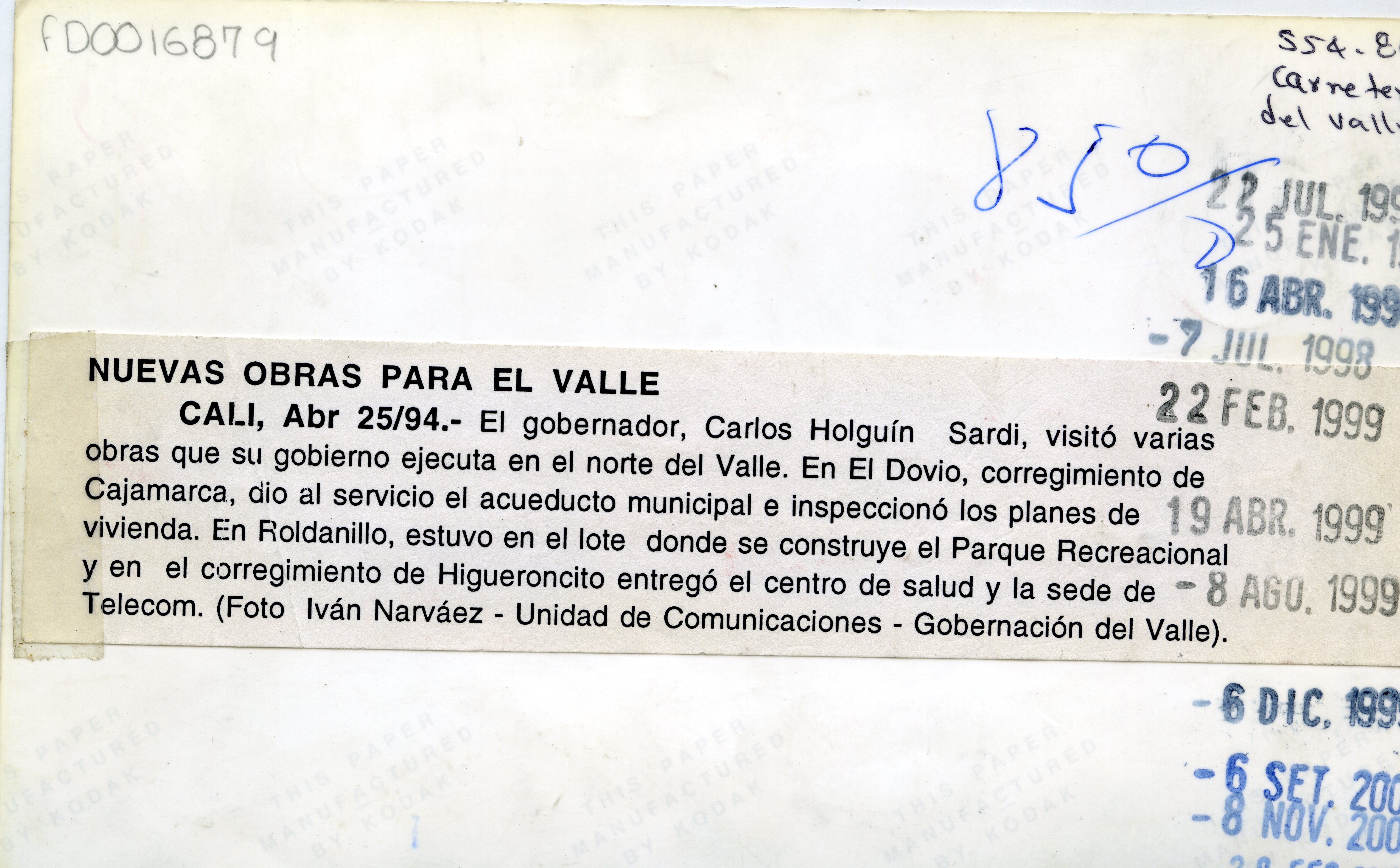 Al reverso de la fotografía se anexa recorte de prensa: "NUEVAS OBRAS PARA EL VALLE CALI, Abr 25/94.- El gobernador, Carlos Holguín Sardi, visitó varias obras que su gobierno ejecuta en el norte del Valle. En el Dovio, corregimiento de Cajamarca, dio al servicio el acueducto municipal e inspeccionó los planes de vivienda. En Roldanillo, estuvo en el lote donde se construye el Parque Recreacional y en el corregimiento de Higueroncito entregó el centro de salud y el sede de Telecom.(Foto Iván Narvaez - Unidad de comunicaciones - Gobernación del Valle)."
