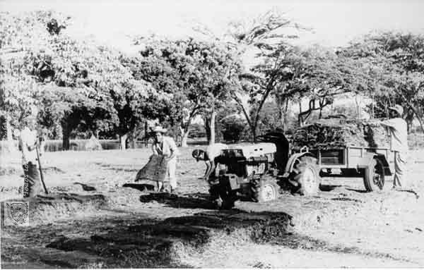 Limpieza del campo donde se construiría la cancha de fútbol de la Universidad San Buenaventura. Cali. C. 1975.