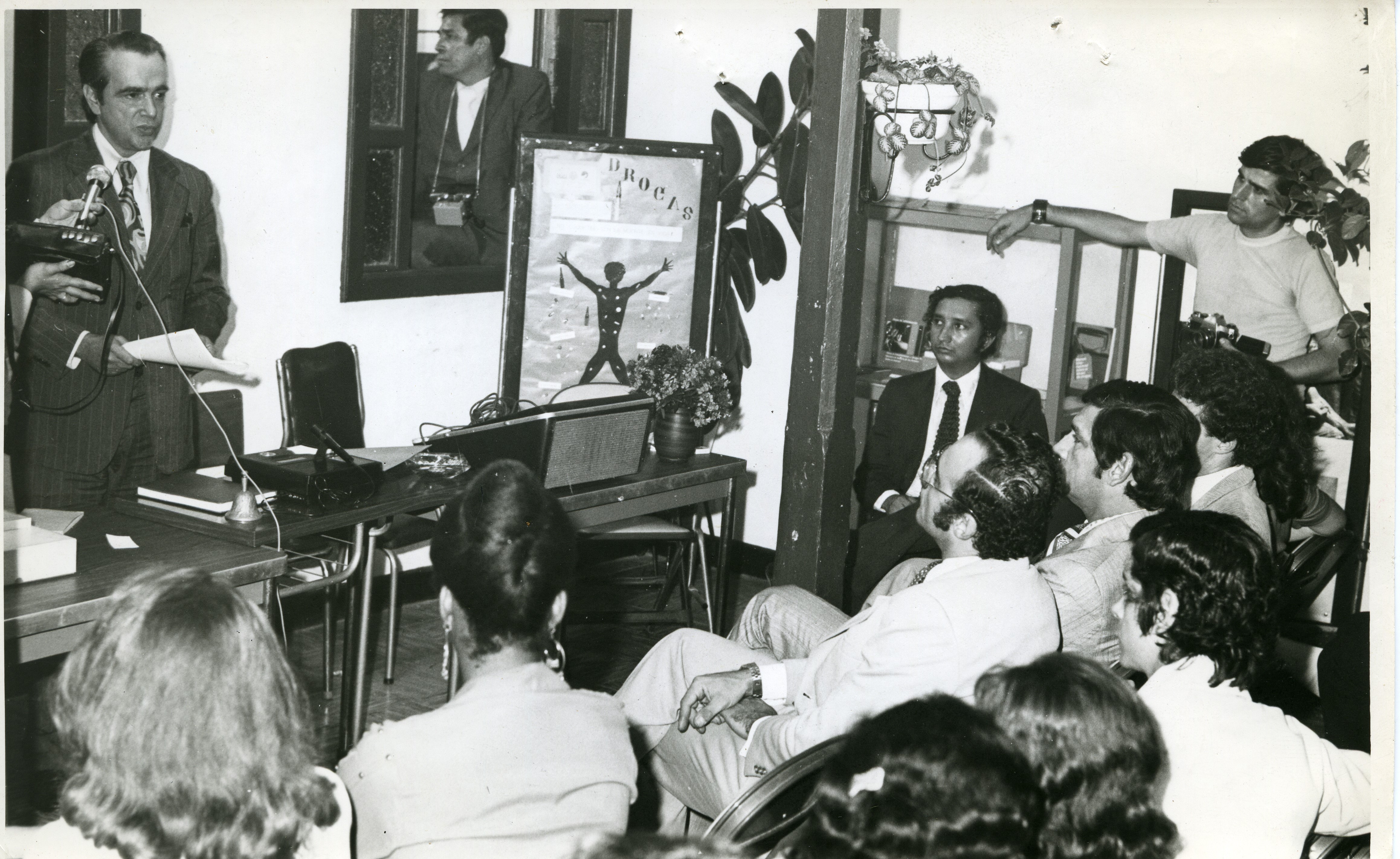 En la exposición se observa un afiche con una silueta humana con un título de drogas