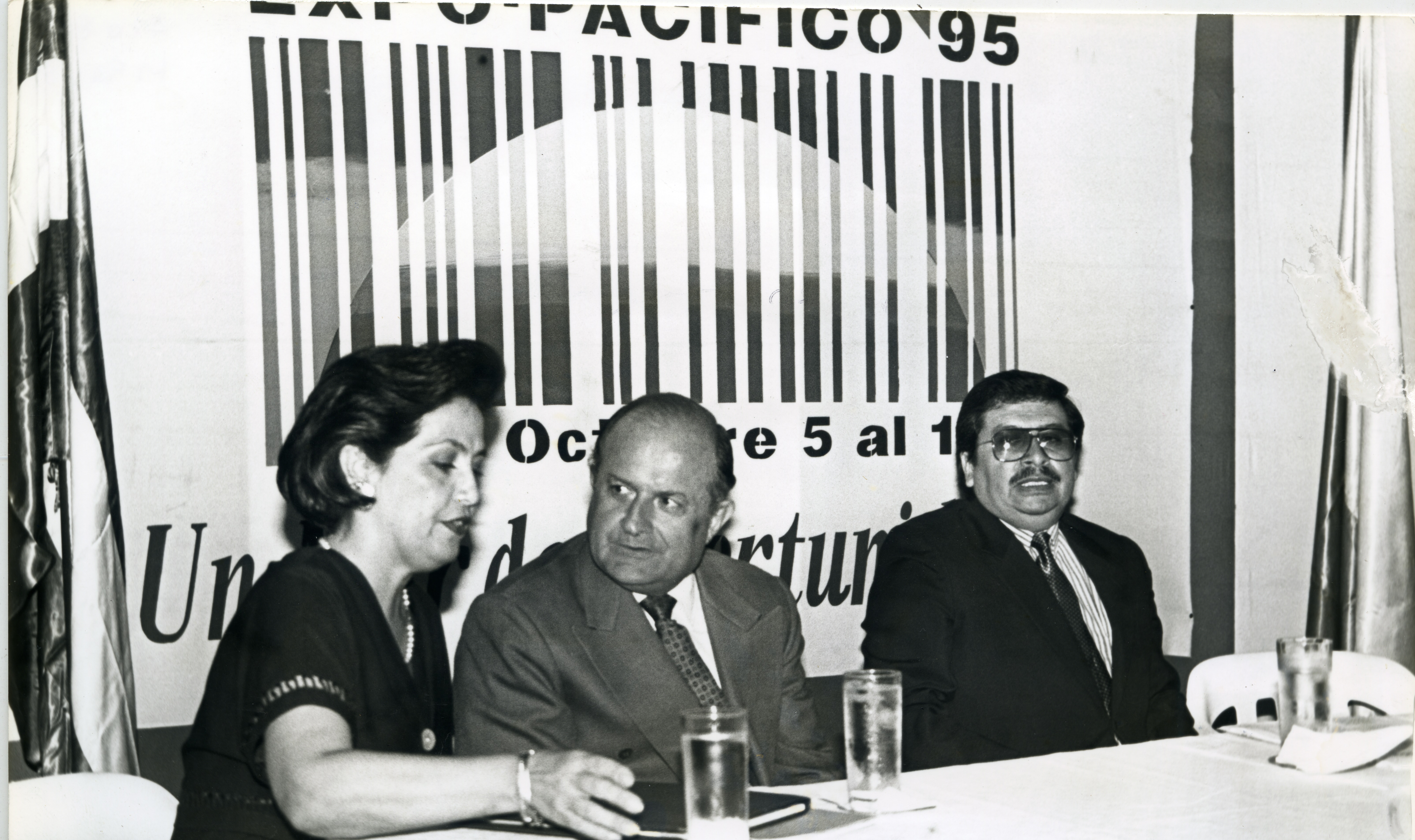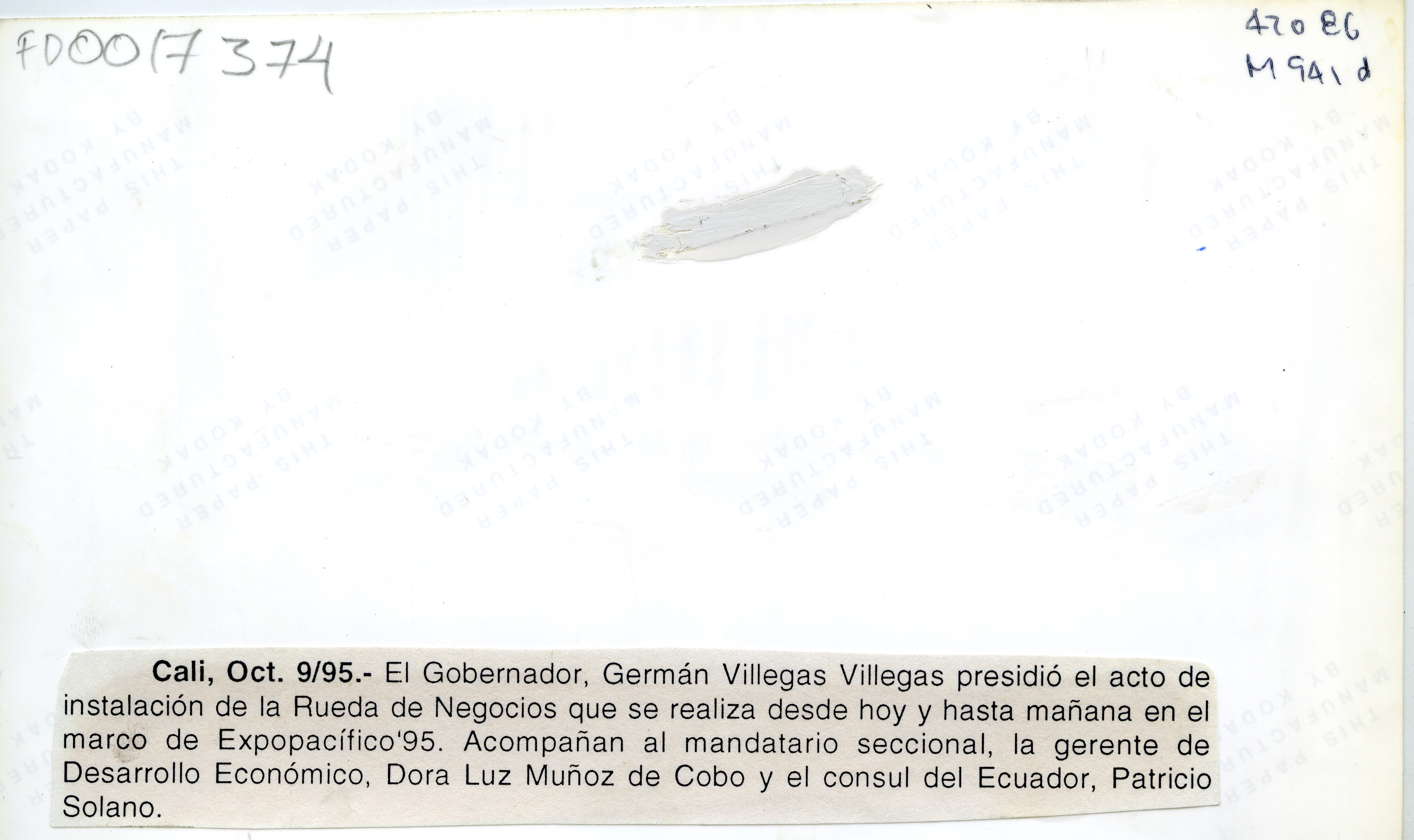 Acto rueda de negociaciones. Al reverso de la fotografía se anexa recorte: El gobernador Germán Villegas Villegas, presidió el acto de instalación de la rueda de negociaciones que se realizara desde hoy y hasta mañana en el marco de Expopacífico´95. Acompañan al mandatario seccional, la gerente de Desarrollo Económico, Luz Muñoz de Cobo, y el cónsul del Ecuador, Patricio Solano
