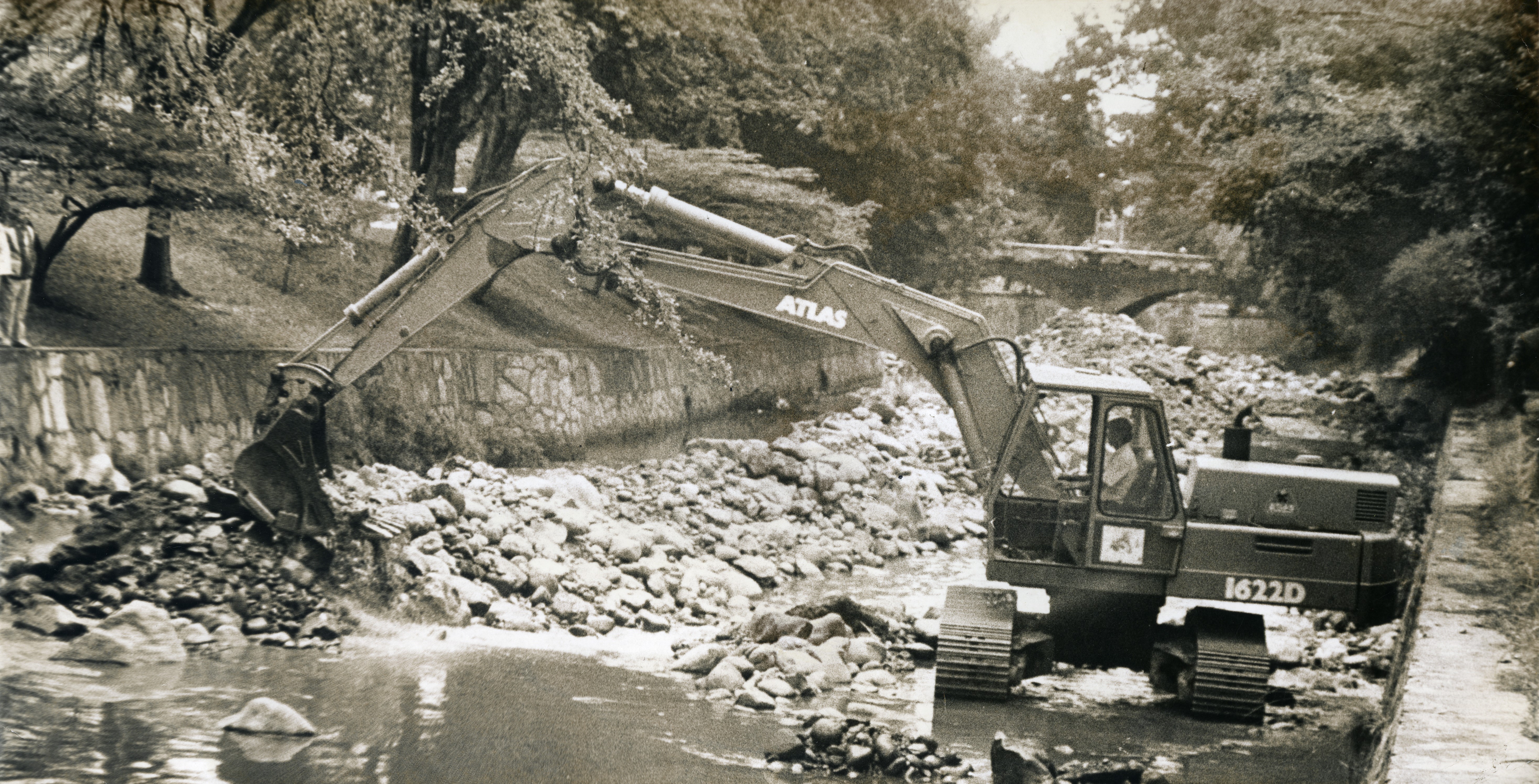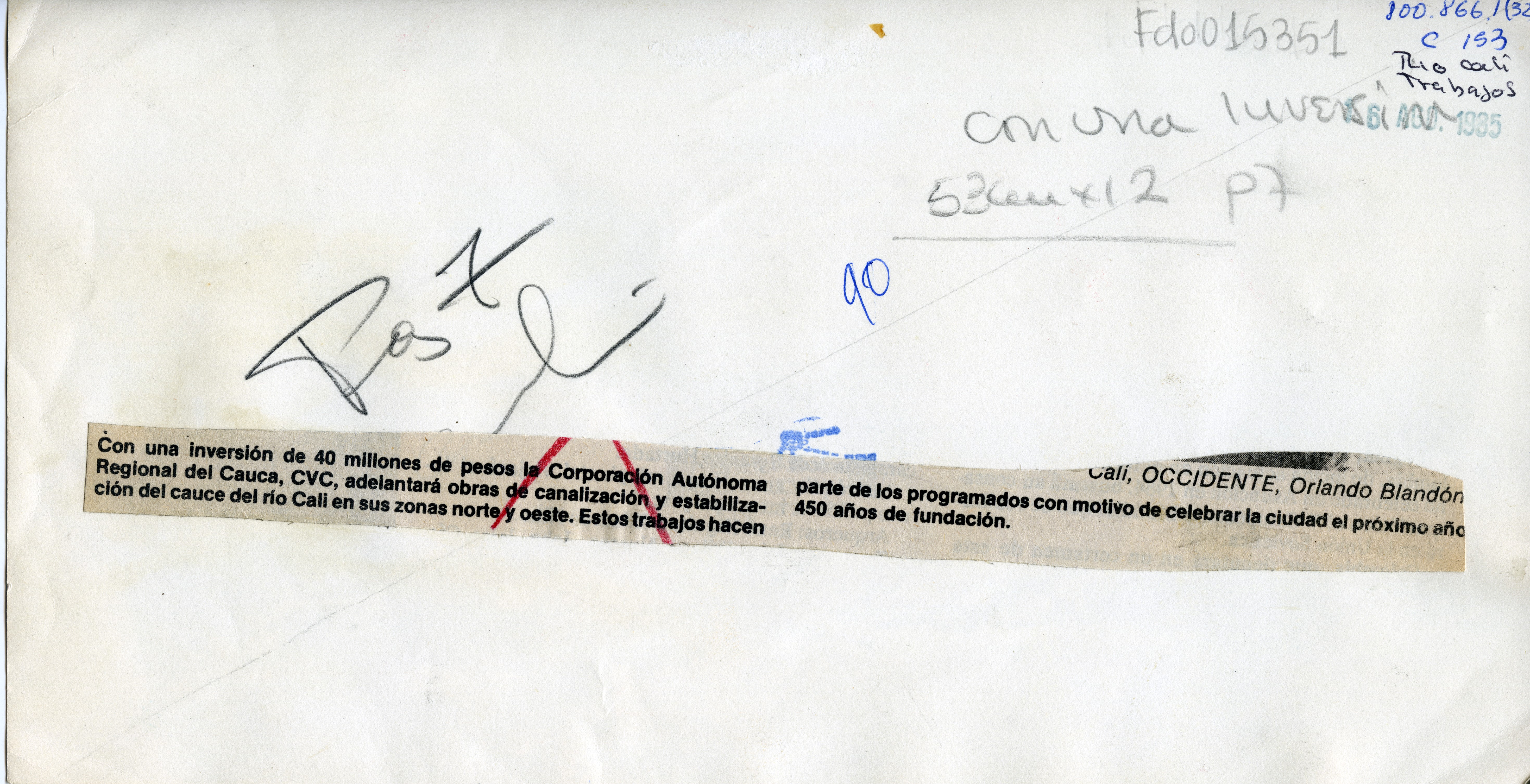 Al reverso de la fotografía se anexa recorte."Con una inversión, de 40 millones de pesos la Corporación Autónoma Regional del Cauca, CVC, adelantará obras de canalización y estabilización del Cauca del río Cali en sus zonas norte y oeste. Estos trabajos hacen parte de los programados con motivo de celebrar la ciudad el próximo año 450 años de fundación”.