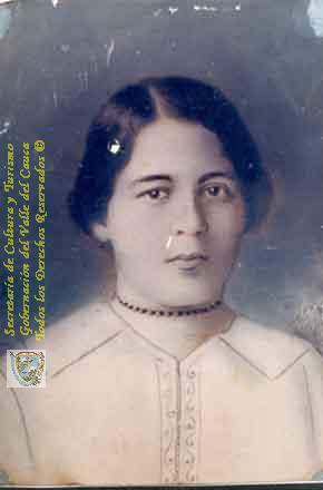 Asunción Aldana. La forma de llevar el cabello y su vestido de escote alto fueron propios de la década del 20 y 30. Buga. C. 1930.