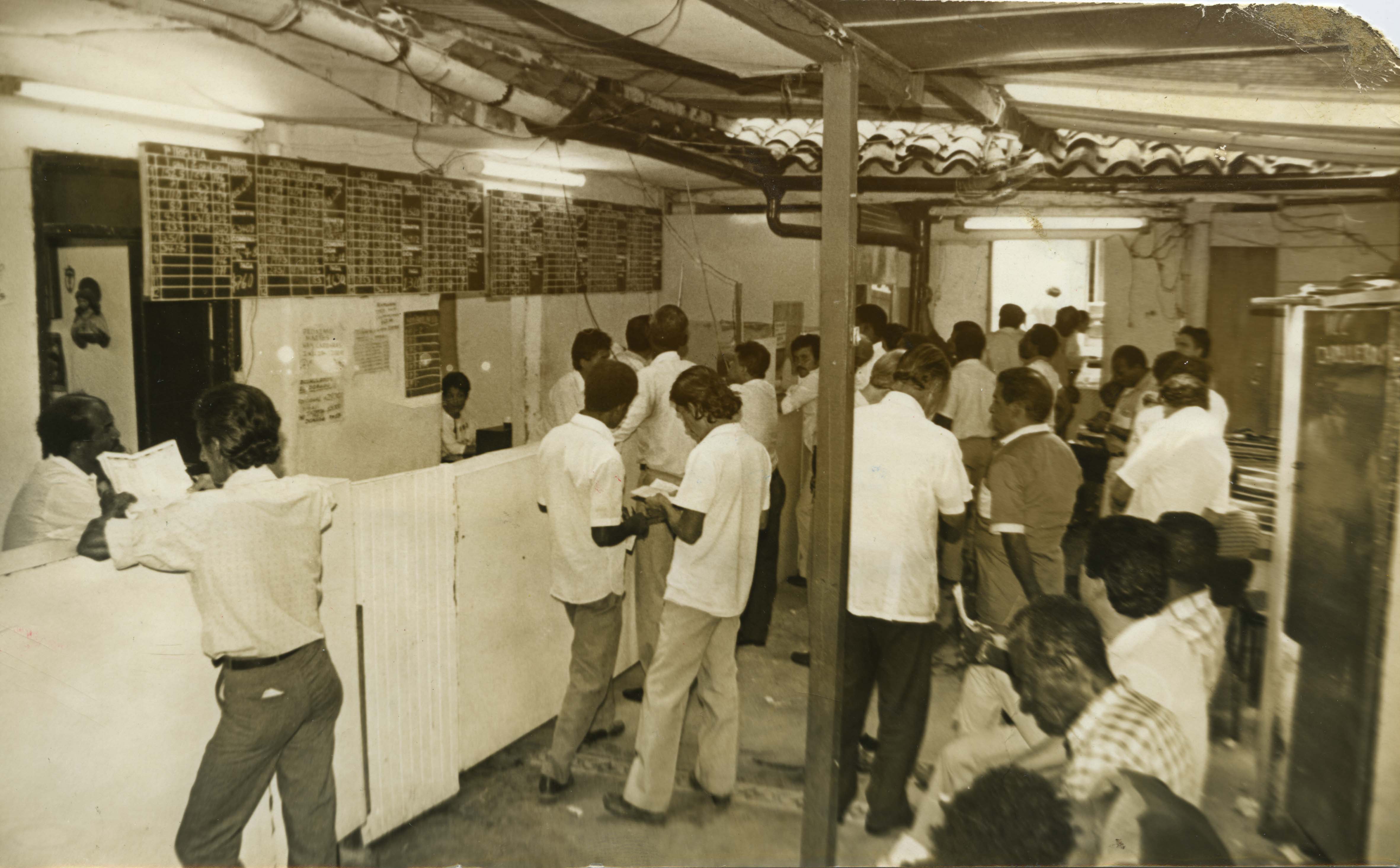 En el pie de foto dice lo siguiente: “Armados” de la revista con los pronósticos, los apostadores estudian cada una de las carreras para escoger el o los caballos a los cuales jugarán sus pesos. / El Archivo del Patrimonio Fotográfico y Fílmico del Valle del Cauca es responsabilidad de la Biblioteca Departamental del Valle Jorge Garcés Borrero, por convenio de cooperación suscrito con la Secretaría de Cultura Departamental, con el fin de aunar esfuerzos para su conservación, preservación y divulgación del Archivo entre la comunidad Vallecaucana, especialmente entre los estudiantes e investigadores que visitan la Biblioteca, propiciando su uso y consulta permanente. La universidad Icesi es un colaborador en el proceso de difusión, facilitando la tecnología que permite la consulta de las imágenes.
