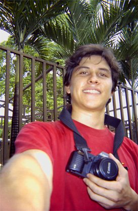 Primer plano. Autorretrato. Sobresalen las palmas en el fondo de la imagen y la reja de seguridad que encierra en antejardín de la vivienda vecina.