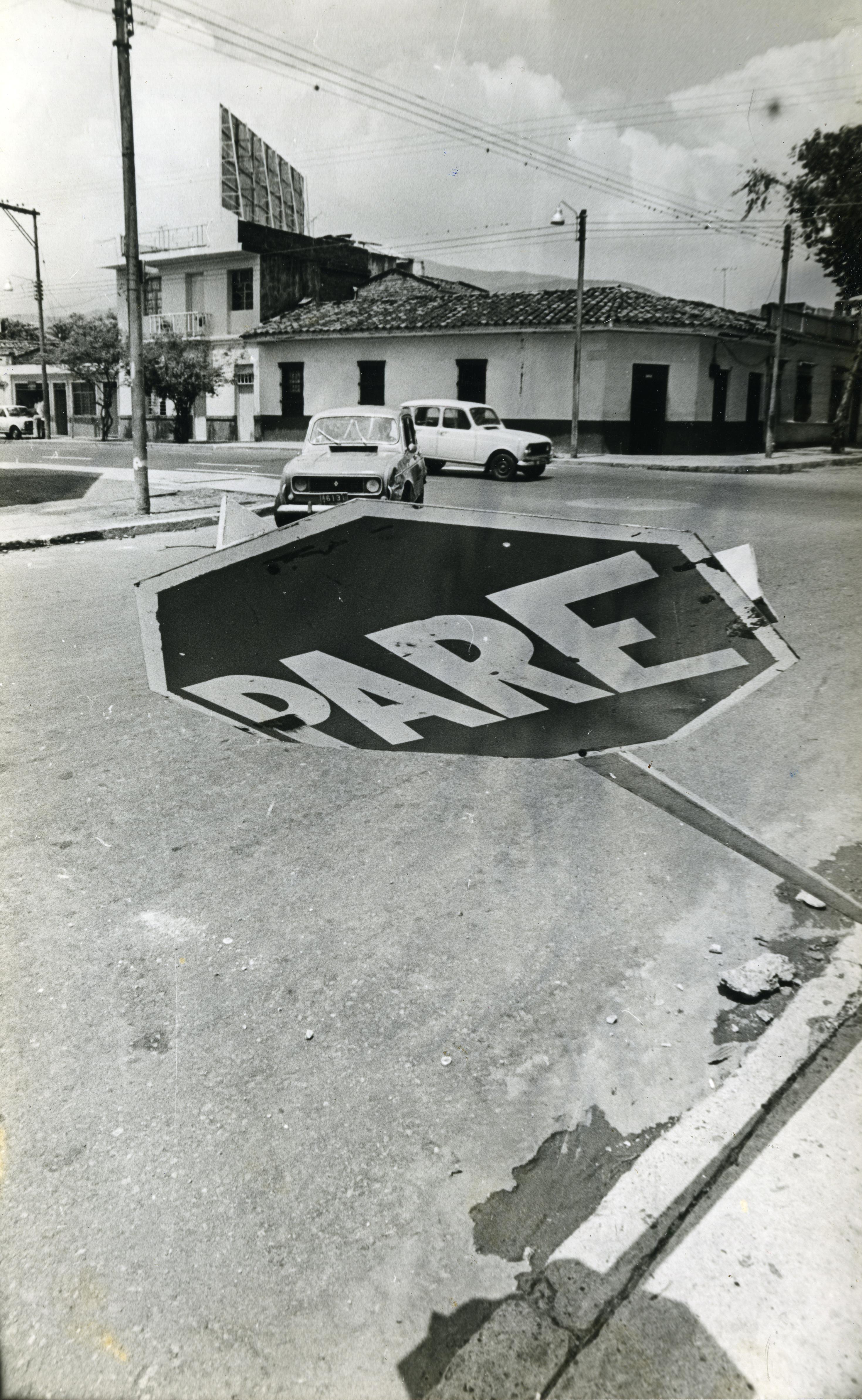 En la gráfica se observa una señal de pare doblada y a punto de carer al suelo. Se observan algunos carros transitando. Esta foto pertenece a la sección "Chiva Tita" del Diario Occidente.