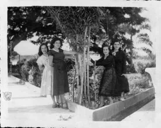 Amigas reunidas en el parque del pueblo. Obsérvese la moda de las mujeres y el cuidado de las zonas verdes de la plaza. 1950