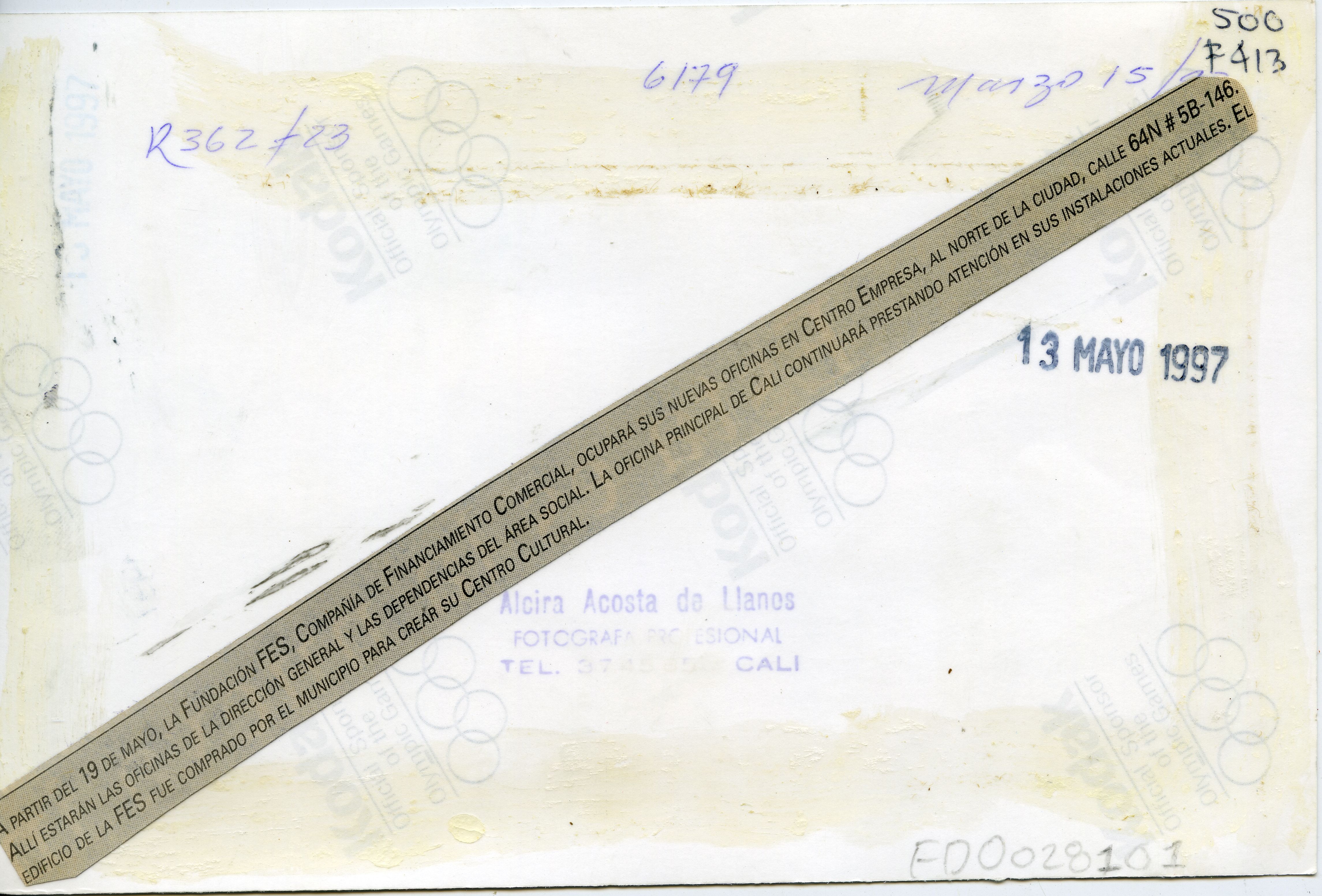 Reverso:"A partir del 9 de mayo, la Fundación FES, Compañía de Financiamiento Comercial, ocupará sus nuevas oficinas en Centro Empresa, al norte de la ciudad, calle 64N#5B-146. Allí estarán las oficinas de la dirección general y las dependencias del área social. La oficina principal de Cali continuará prestando atención en sus instalaciones actuales. El edificio de la FES fue comprado por el municipio para crear su Centro Cultural"