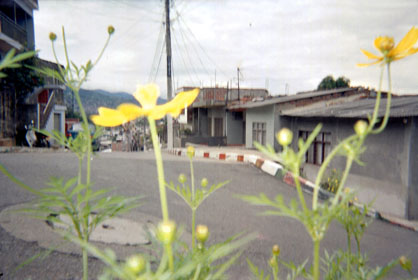 Primerísimo primer plano de flor. Exterior día. Perspectiva de calle con profundidad de campo. Se aprecia a lo lejos fragmento de cadena montañosa.