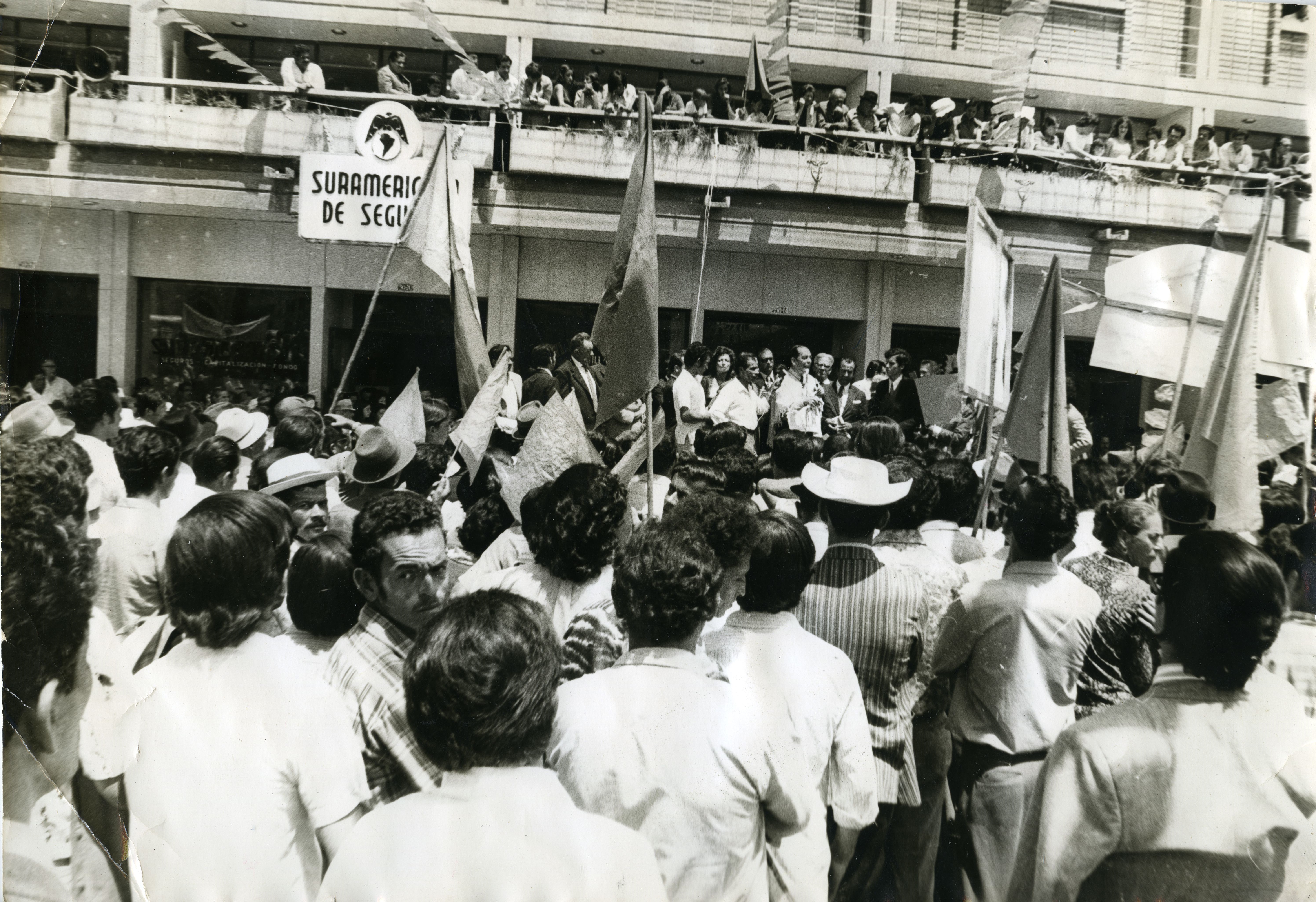 En la fotografía podemos apreciar al señor Álvaro Gómez Hurtado en una de sus campañas políticas, a su alrededor hay un gran número de segidores apoyándolo.