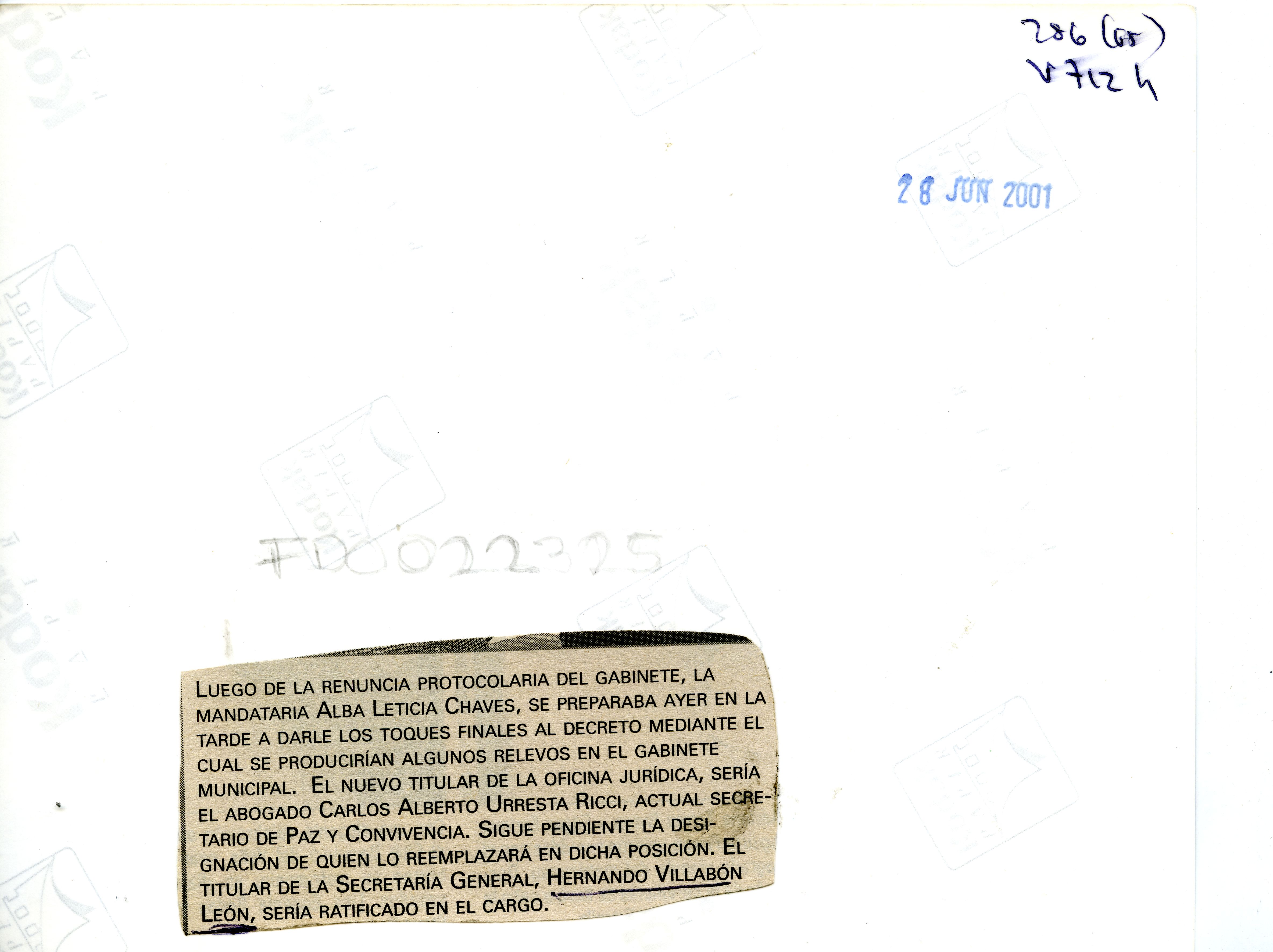 Se anexa recorte: "Luego de la renuncia protocolaria del gabinete, la mandataria Alba Leticia Chaves, se preparaba ayer en la tarde a darle los toques finales al decreto mediante el cual se producirían algunos relevos en el gabinete municipal. El nuevo titular de la oficina jurídica, sería el abogado Carlos Alberto Urresta Ricci, actual secretario de paz y convivencia. Sigue pendiente la designación de quien lo reemplazará en dicha posición. El titular de la Secretaría General, Hernando Villabón León, sería ratificado en el cargo.