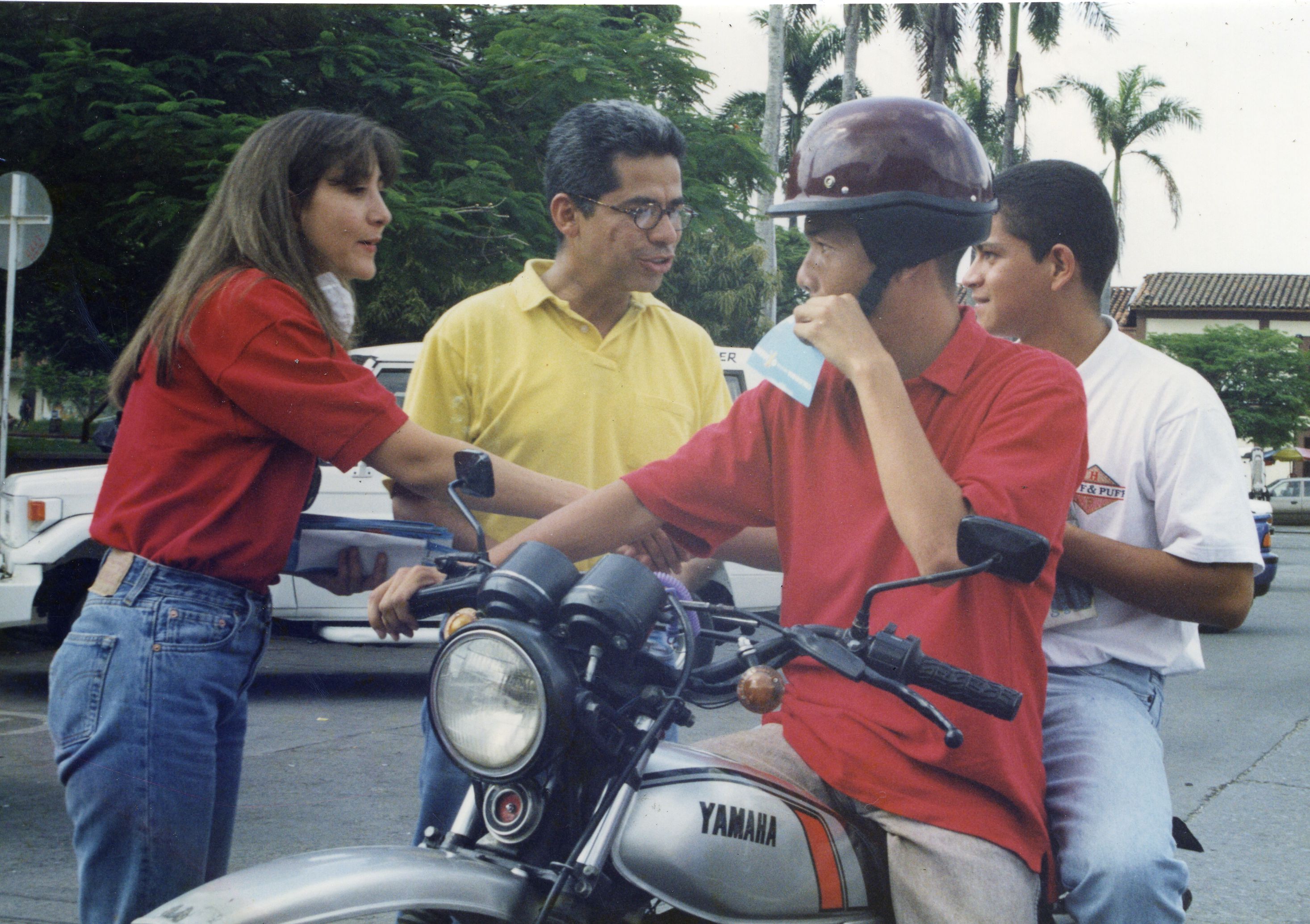 "Íngrid Betancourt Pulecio nació en Bogotá el 25 de diciembre de 1961. Politóloga y Política. Inició su carrera política en la Cámara de Representantes. Fue reconocida por su lucha contra la corrupción política. Apoyó la salida pacífica del conflicto armado de Colombia. Renunció al Partido Liberal tras denunciar la crisis del Proceso 8.000. Se postuló por el Partido verde Oxígeno al Senado en las elecciones legislativas del año 1998, donde fue electa con la primera mayoría nacional. Renunció a su escaño en 2001 para postularse a la presidencia de su país en las elecciones 2002 - 2004. El 23 de febrero de 2002, fue secuestrada cuando se dirigía a la zona de distensión establecida por el regente presidente Andrés Pastrana. Con este acontecimiento, ganaría la solidaridad de muchos seguidores, convirtiéndose en una causa célebre. El 2 de julio de 2008 la Fuerza Pública realizaron una operación de inteligencia militar; resultado de esto, se da su liberación junto con tres contratistas estadounidenses y once miembros del Ejército Nacional que habían permanecido secuestrados, algunos por más de diez años. Después de su liberación, se residencia con su familia a Francia, dedicándose a trabajar por las víctimas del terrorismo. Condecoraciones: Caballero de la Orden Nacional de la Legión de Honor, Premio TV y Novelas México, Honorary citizen of Paris 2002, Petra-Kelly-Preis 2002, Medalla Geuzen 2004, Premio M100 Media 2008, Premio Princesa de Asturias de la Concordia 2008, 100 Mujeres de la BBC 2013. En la foto aparece Ingrid Betancourt con su asistente, repartiendo propaganda política a los transeúntes."