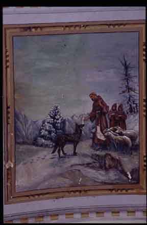 Mural que recrea una escena de la vida de San Francisco. Murales laterales. Iglesia de San francisco. cali, C. 1995