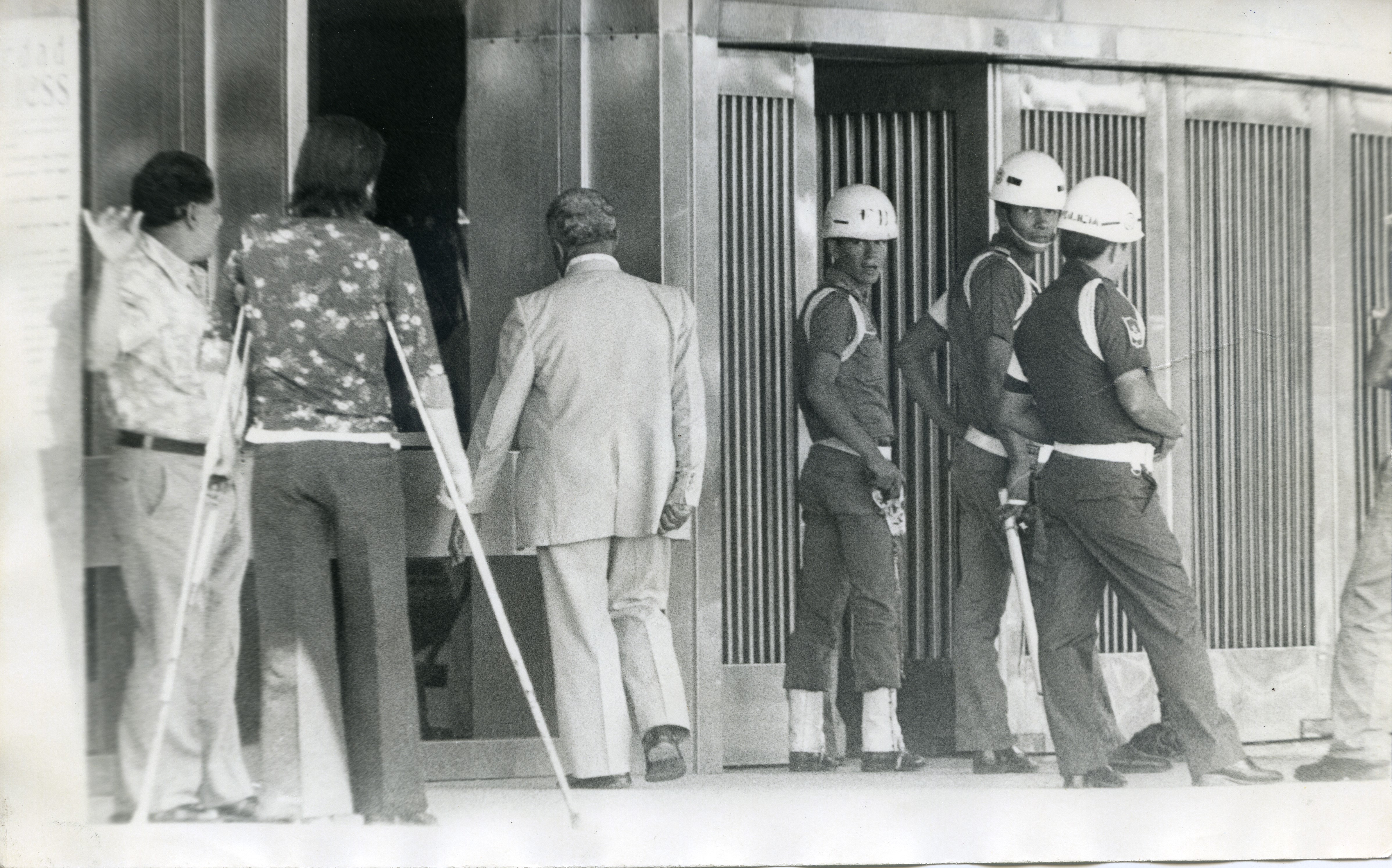 Se evidencia dos adultos mayores y un caballero en muletas, al lado se encuentra 3 personas de la fuerza pública en el I.S.S