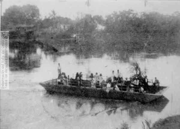 Las barcas (planchones metálicos) han sido un sistema de paso de una orilla a otra del río Cauca. Funcionan por un sistema de poleas aprovechando la fuerza de la corriente. La Victoria. Fecha aproximada: 1925.