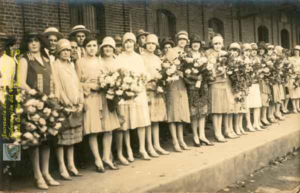 s. n., s. n., s. n., s. n. & s. n. (1928). Delegación de señoritas con ofrendas florales en los andenes de la antigua Estación del Ferrocarril, a la espera de los deportistas que llegaban a las Primeras Olimpiadas Nacionales & 200432. OTRO: Biblioteca Departamental Jorge Garces Borrero.