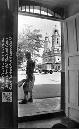 IVAN NARVAEZ (1970). Plaza central e iglesia, vistas desde uno de las tiendas ubicadas en el marco de la Plaza & 500140. GINEBRA: Biblioteca Departamental Jorge Garces Borrero.