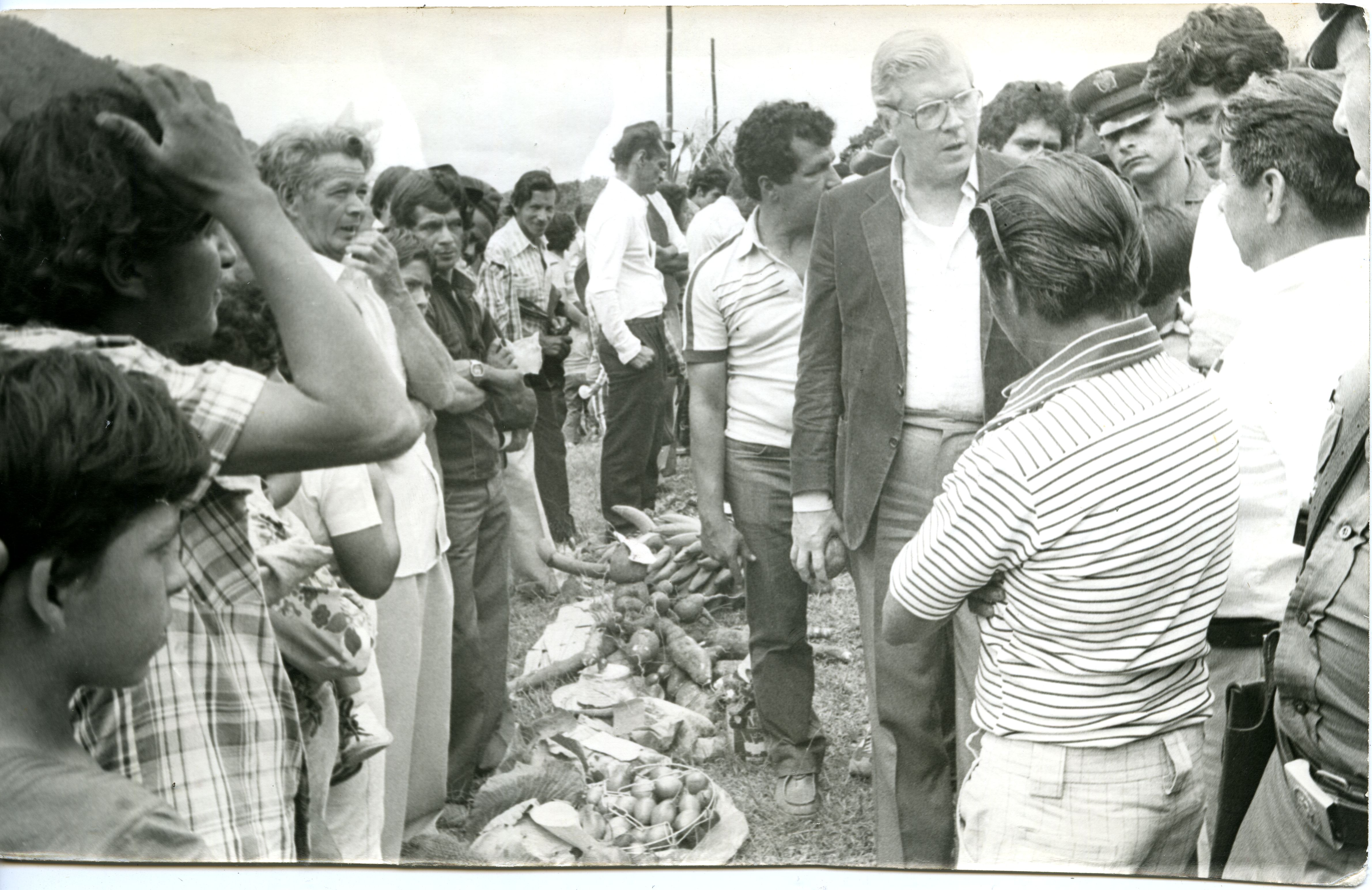 Foto de un grupo de personas reunido, en medio de los mismos se encuentran algunas yucas, plátanos y otras cosechas
