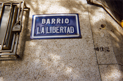 Detalle de placa de identificación del barrio La Libertad. Contrasta el nombre con el estado del granito y la reja con candado al lado izquierdo. Plano medio. Toma en contrapicado.