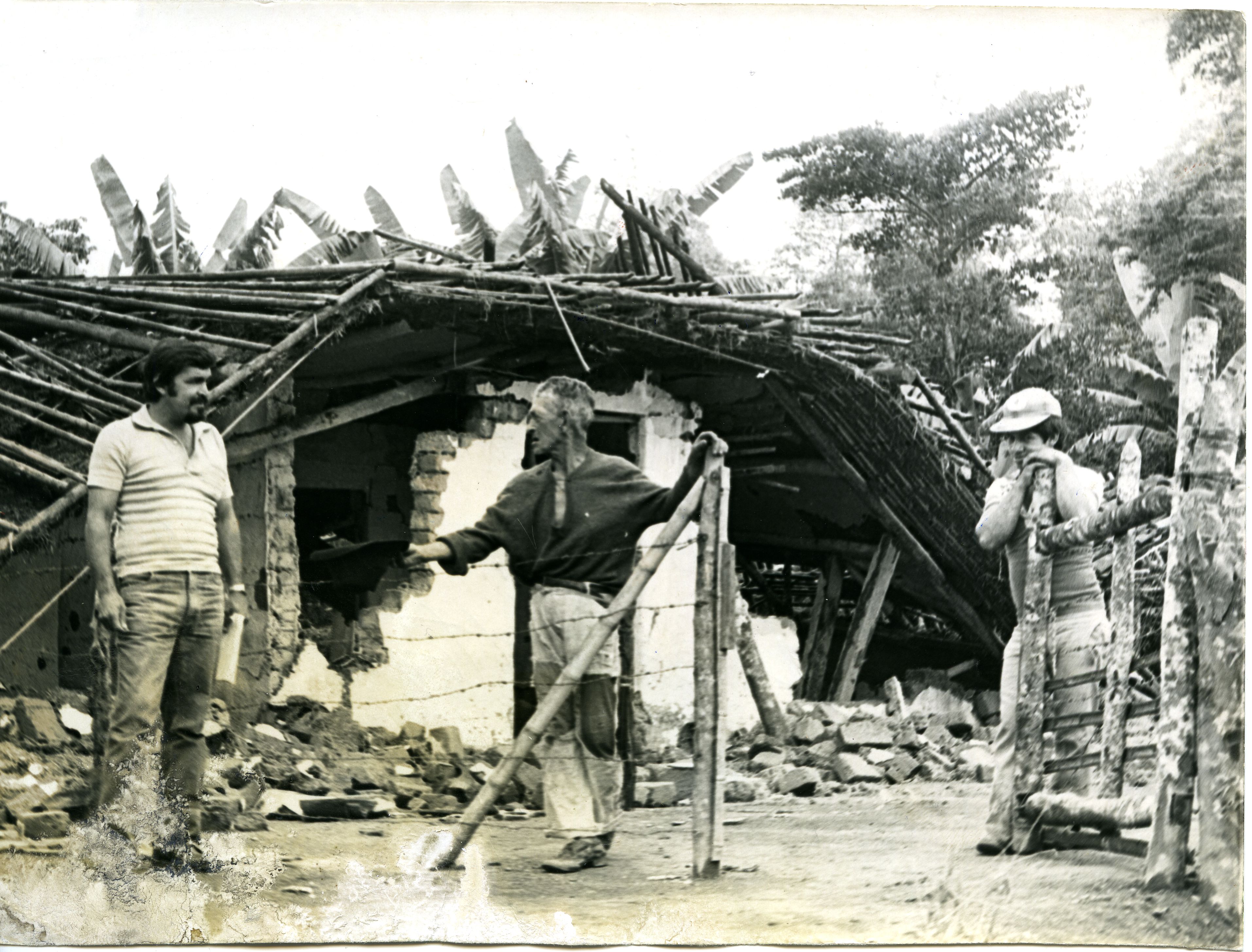 En la gráfica se observan tres hombres, en la parte de atrás de los mismos se encuentra una casa en reinas debido a un terremoto