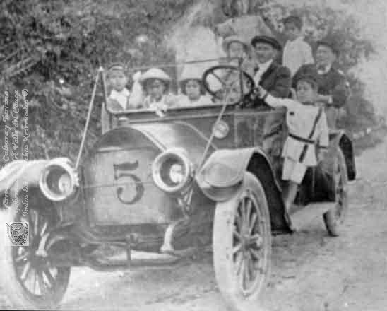El Señor Jorge Pineda Cordobés y su familia, este es uno de los primeros vehículos que llegaron al Valle del Cauca, traídos por el señor Pineda. Su No. de placa el 5. Santiago de Cali, 1915