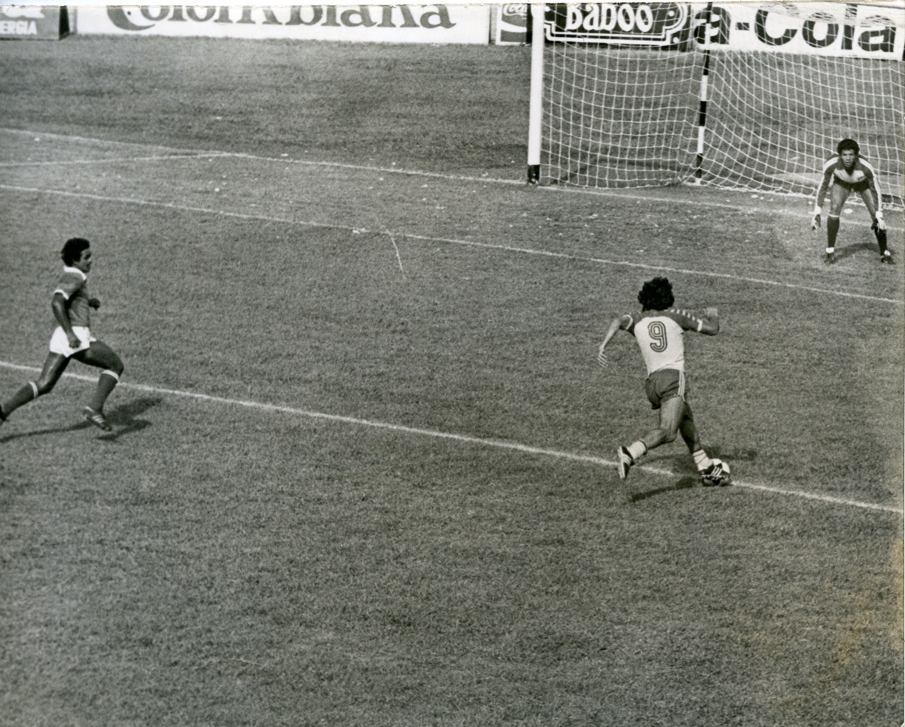Encuentro futbolístico equipo deportivo Cali. Apreciamos portero y jugadores en escena