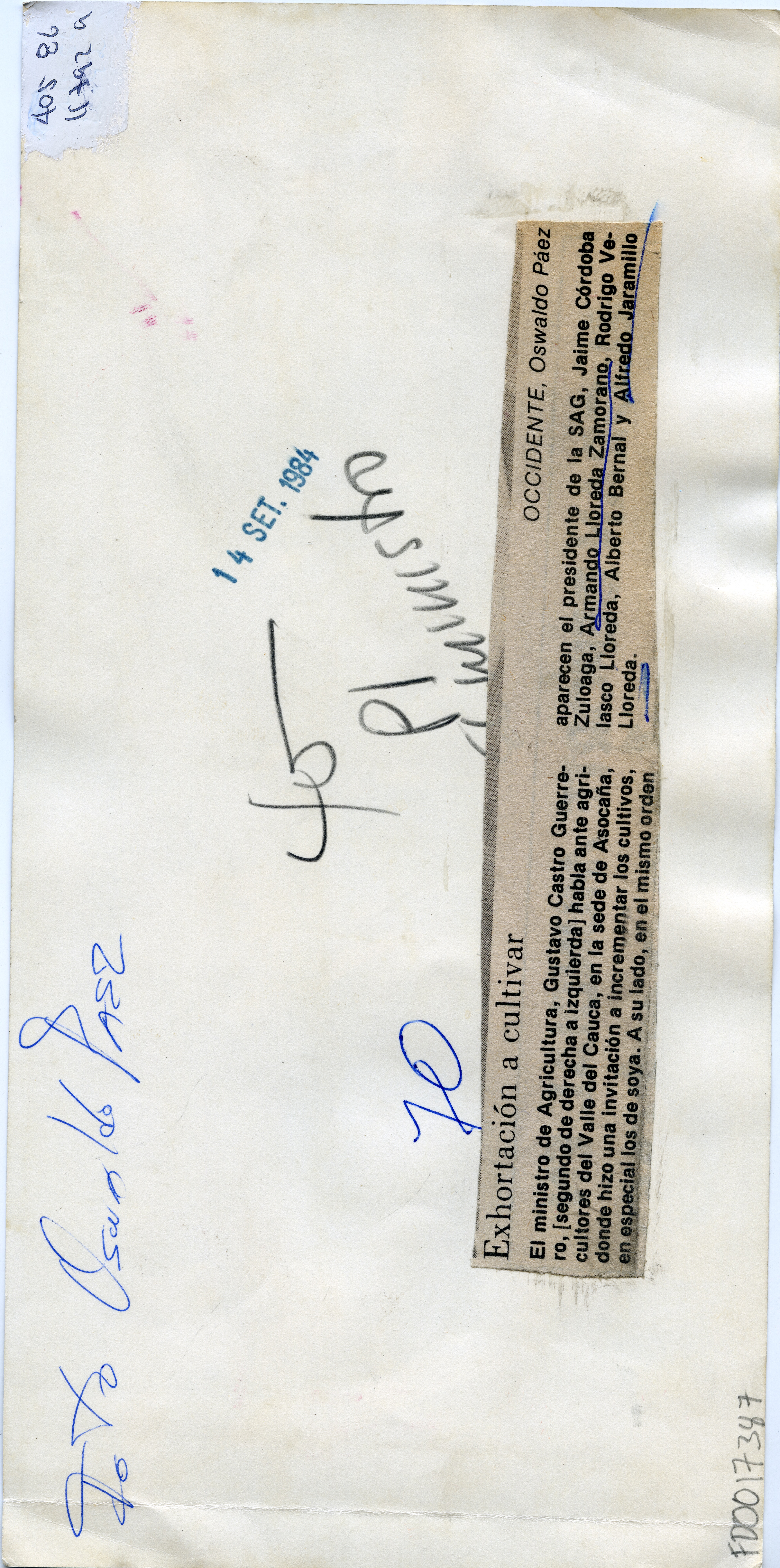 Exhortación a cultivar. El ministro de Agricultura, Gustavo Castro Guerrero, segundo de derecha a izquierda, habla ante ante agricultores del Valle del Cauca, en la sede de Asocaña, donde hizo una invitación a incrementar los cultivos, en especial los de soya. en el mismo orden aparecen el presidente de la SAG,Jaime Córdoba Zuluaga, Armando Lloreda Zamorano, Rodrigo Velasco Lloreda, Alberto Bernal y Alfredo Jaramillo Lloreda
