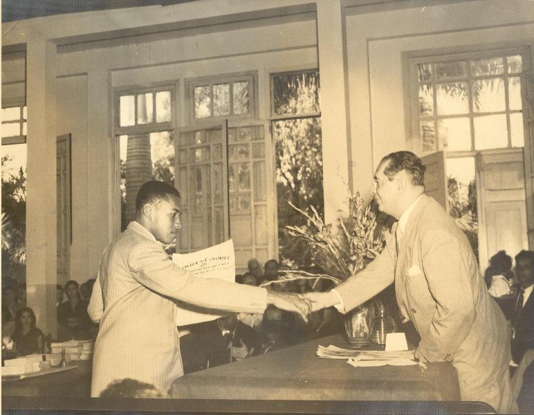 | dc.description | Clausura de fin de año, en la Escuela de Artes y Oficios. El primer Rector Tulio Ramírez entregando mención por excelencia a José Arjail Pedroza. Esta institución se creo por Acuerdo Municipal No 25 de 1933, que ordeno construir una escuela de formación técnico-práctica, para dar respuesta a la necesidad de mano de obra capacitada, requerida por el crecimiento industrial y urbano de la ciudad. A partir de 1945 se le empezo a llamar Instituto Antonio José Camacho. Actualmente se conoce como Instituto Educativo Técnico Industrial Antonio José Camacho. Santiago de Cali, fecha aproximada, 1950. | spa |