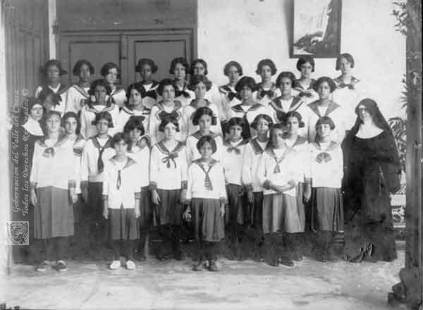 Grupo de alumnas del Colegio de las Hermanas Franciscanas, entre ellas Ruth Gardeazabal. Tuluá. C. 1926.