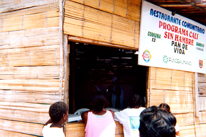 Primer plano de fachada esquinera de una habitación construida en guadua. Tiene un letrero donde perfectamente se puede leer ?Restaurante Comunitario?. Hay varias personas de espaldas a cámara esperando a ser atendidas.