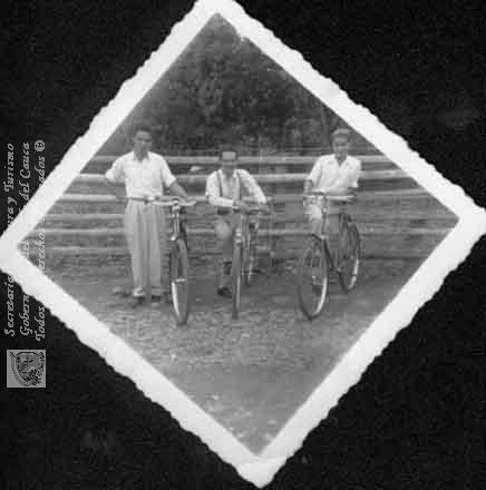 Harli Hernández, Regulo Sánchez y amigo, de paseo en bicicleta en Caloto. 1.958