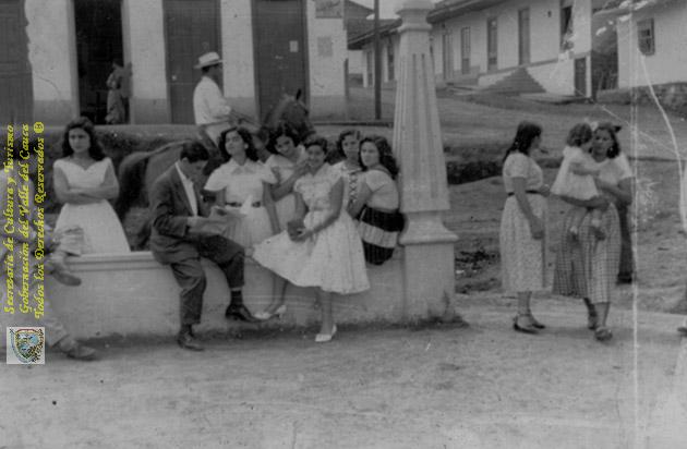 RODOLFO CLAVIJO (1952). La señorita Elisabeth Granada con sus amigas y amigos charlando en los muros del parque principal de Restrepo & 603710. RESTREPO: Biblioteca Departamental Jorge Garces Borrero.