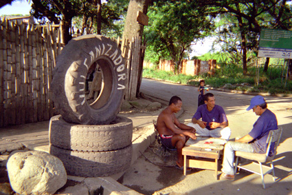 Plano General. Imagen de formato horizontal, tomada en exterior, donde se destaca al extremo izquierdo una composición con llantas, con un aviso de una vulcanizadora. AL extremo derecho junto a las llantas tres hombres sentados jugando dominó. Al fondo vegetación abundante.